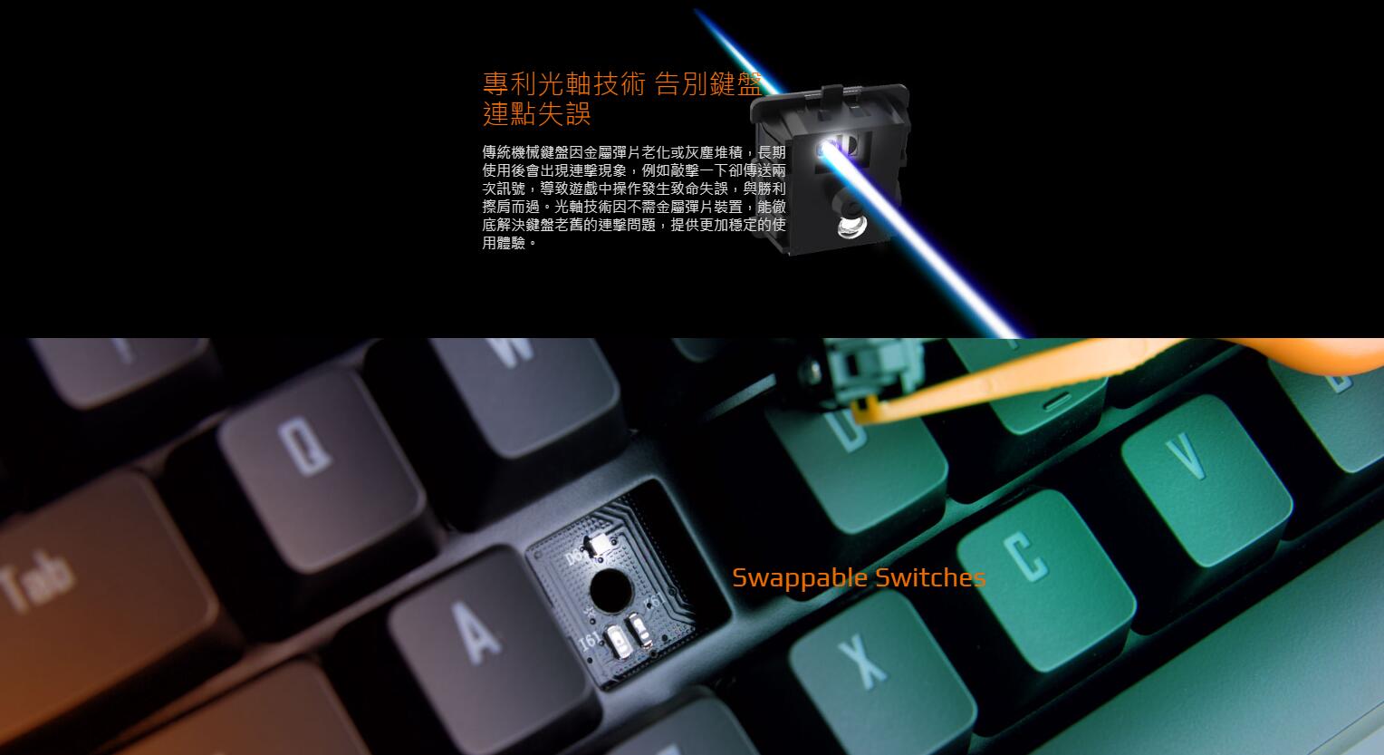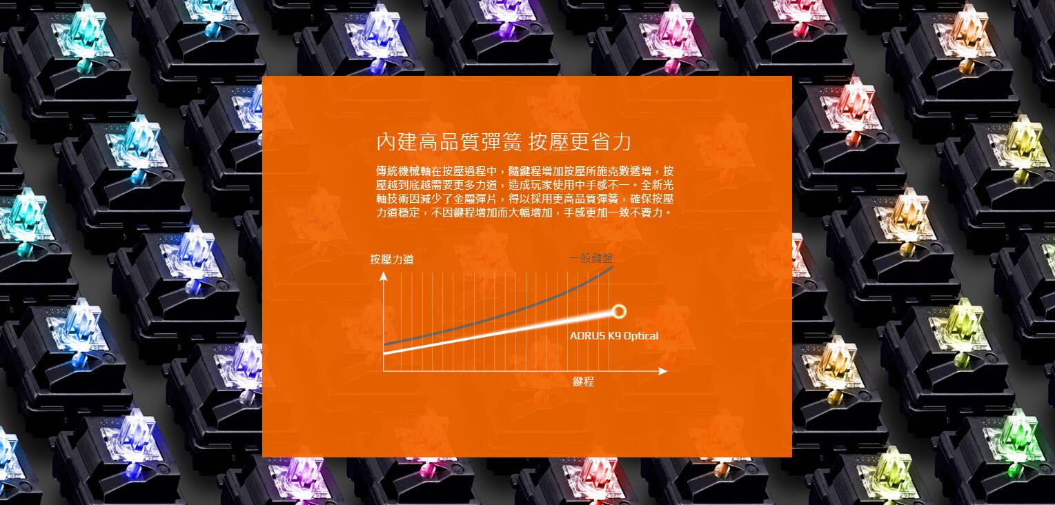 AORUS K9 Optical 電競鍵盤採用最新專利光軸技術,有別傳統鍵盤透過金屬接觸觸發,光軸技術使用光線遮蔽來產生訊號,不僅帶來光速0.03ms反應時間,更具有超長點擊壽命、防潑水等特色,同時玩家還可自由拆換鍵帽及軸體,客製專屬手感!