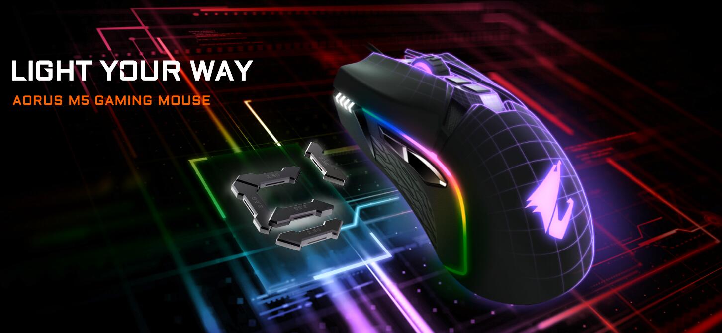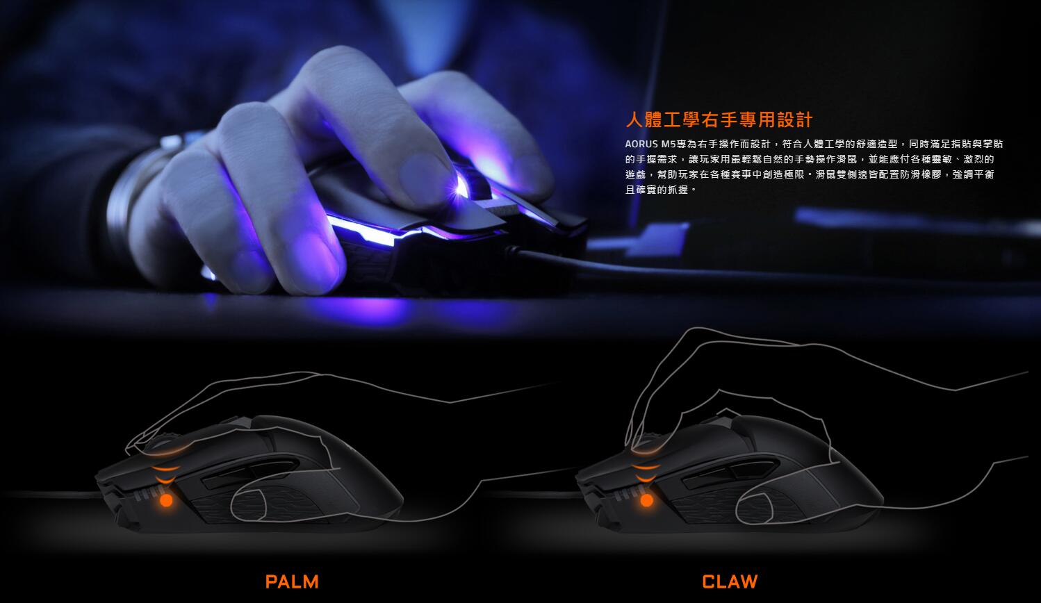 自訂RGB燈光幾乎是電競滑鼠的標準配備,AORUS M5除了可支援到1677萬色的變化,更可透過AORUS Engine軟體客製設定各種發光模式,高達23區的獨立分區設定,創作個人喜好的燈光效果,更棒的是可以跟AORUS RGB Fusion系列產品同步燈光,享受和諧一致的遊戲裝備。