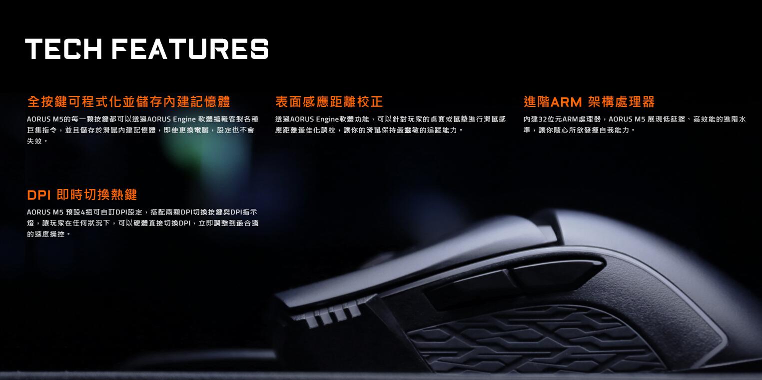 AORUS M5 採用頂級電競光學感應核心(Pixart 3389),可以支援到實體16000dpi、400ips最快追蹤速度、以及50g最大加速度的感應能力,其中DPI值更可依玩家需求,以50dpi為單位微調至最適靈敏度,完全去除玩家更換新滑鼠所需要的適應期,提供玩家絕佳的操控、速度與精準度,讓電競玩家盡情展現自我的技能。