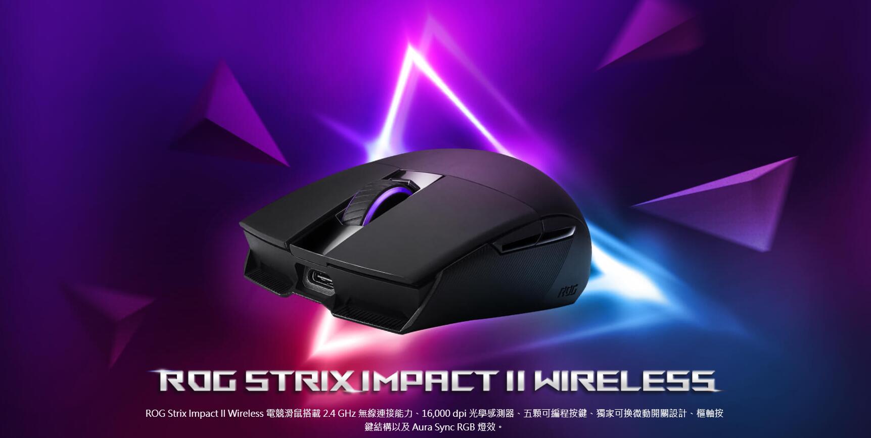 ROG 與專業遊戲玩家共同設計 ROG Strix Impact II Wireless,打造雙手通用的人體工學設計,其重量僅 93 公克。搭載 16,000 dpi 感測器最高可追蹤 400 ips,最高加速度達 40 G,提供使用者高精確度、快速反應及準確控制,而且毫無延遲。