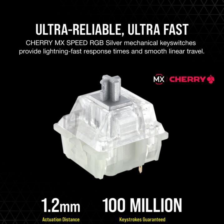 CHERRY MX SPEED Silver keyswitches provide lightning-fast response times with an extremely short actuation distance of just 1.2mm, perfect for fast-paced competitive gameplay.