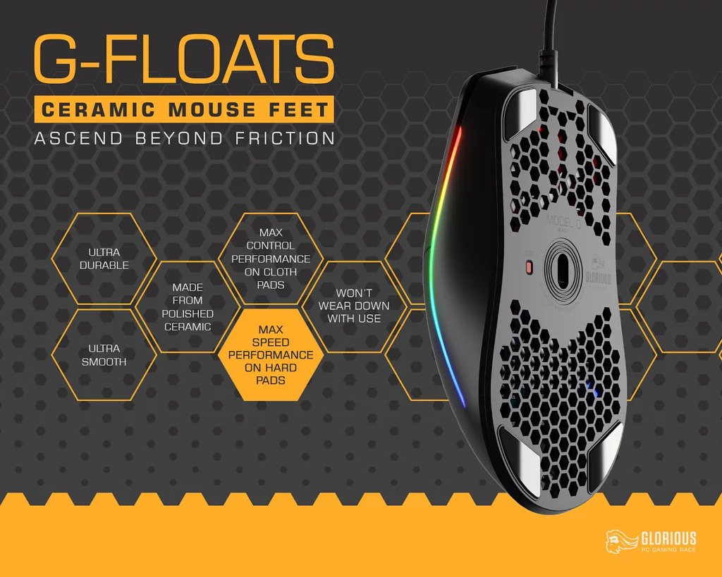 Glorious G-Floats are our premium, ultra-durable and ultra-smooth mouse feet, designed for all our Glorious mice. The G-Floats are made from Polished Ceramic, giving you the most amazing, satisfying, and consistent glide you have ever experienced. So frictionless you'll feel like your mouse is floating!