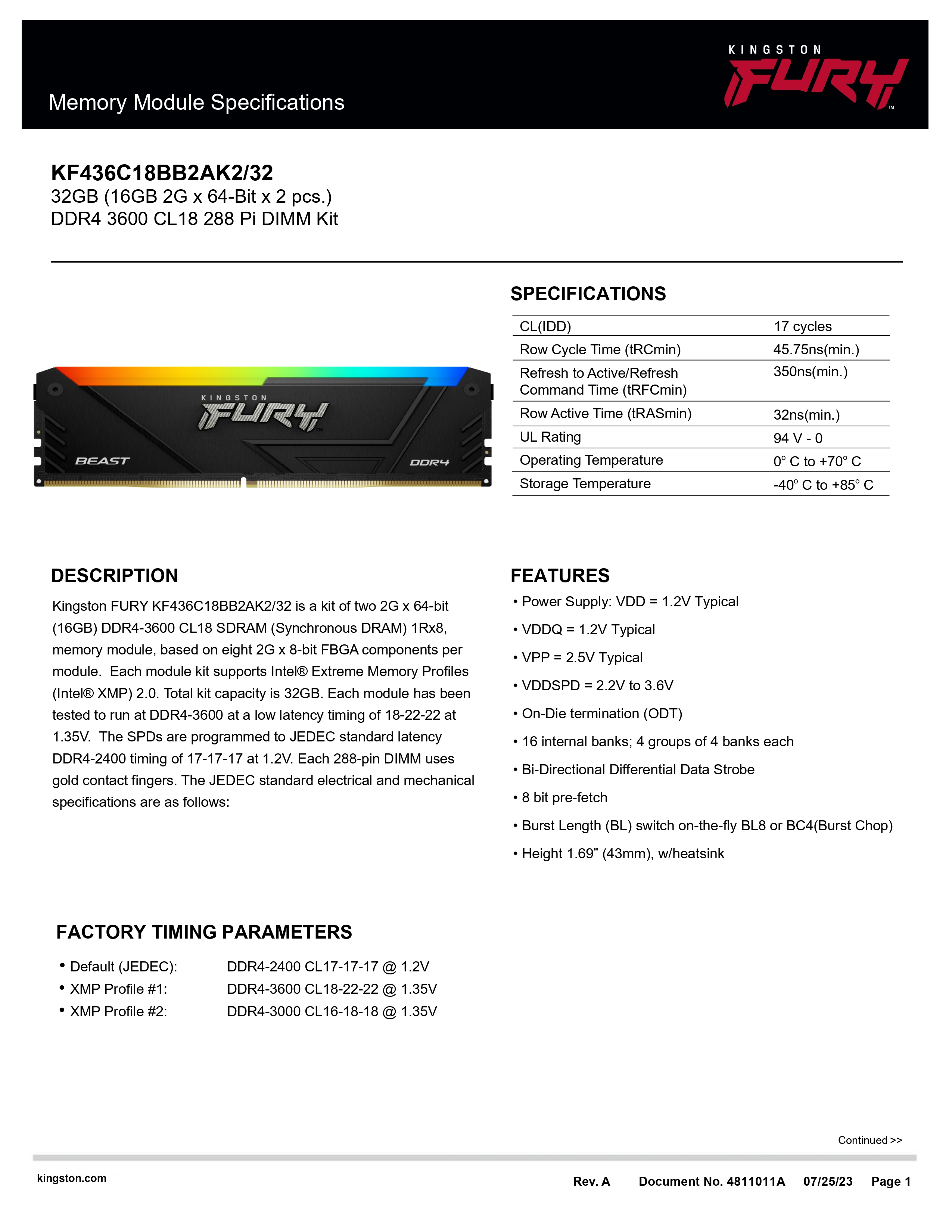 Kingston Fury Beast RGB DDR4-3600 16GB*2 CL18 記憶體(KF436C18BB2AK2/32)