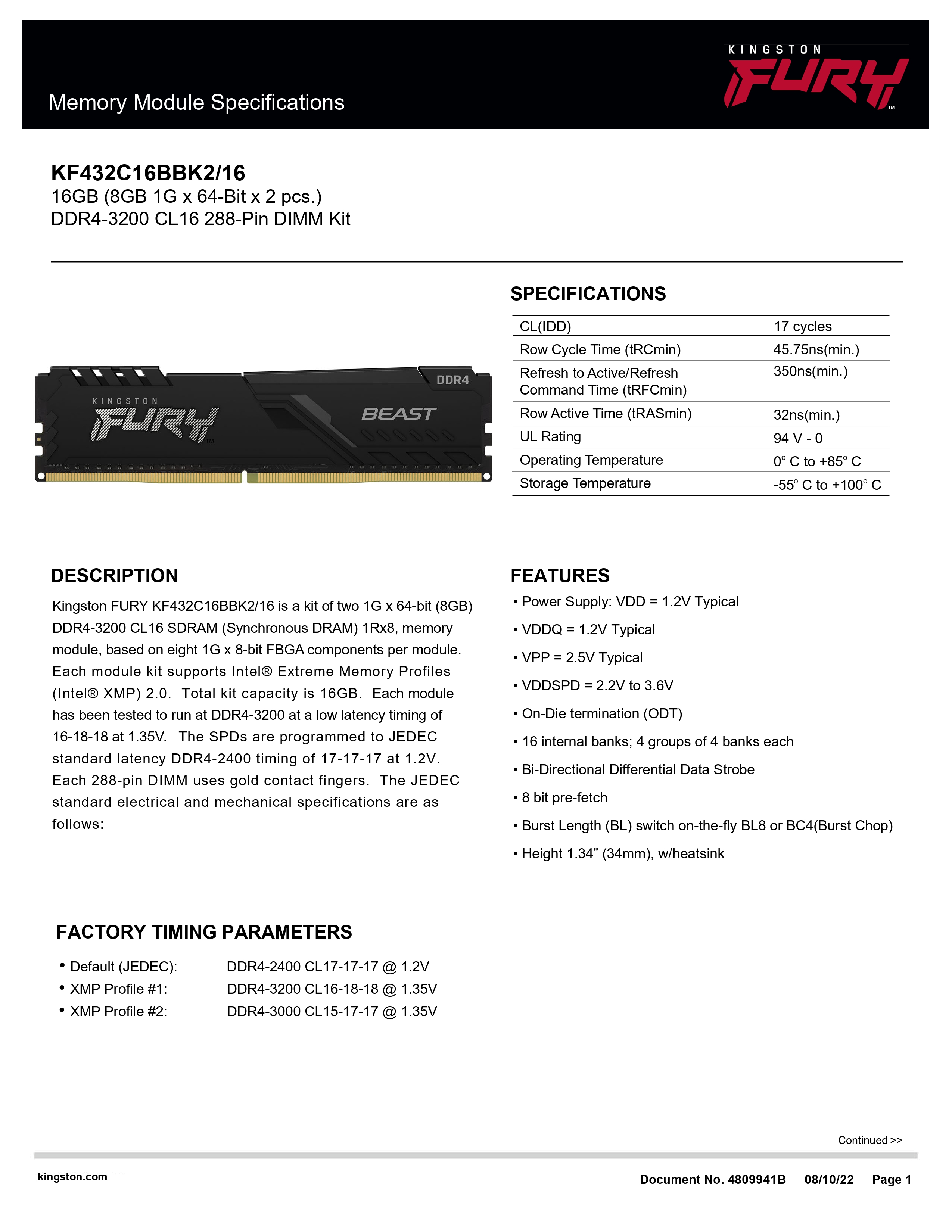 Kingston Fury Beast Black DDR4-3200 8GB*2 CL16 記憶體(KF432C16BBK2/16)