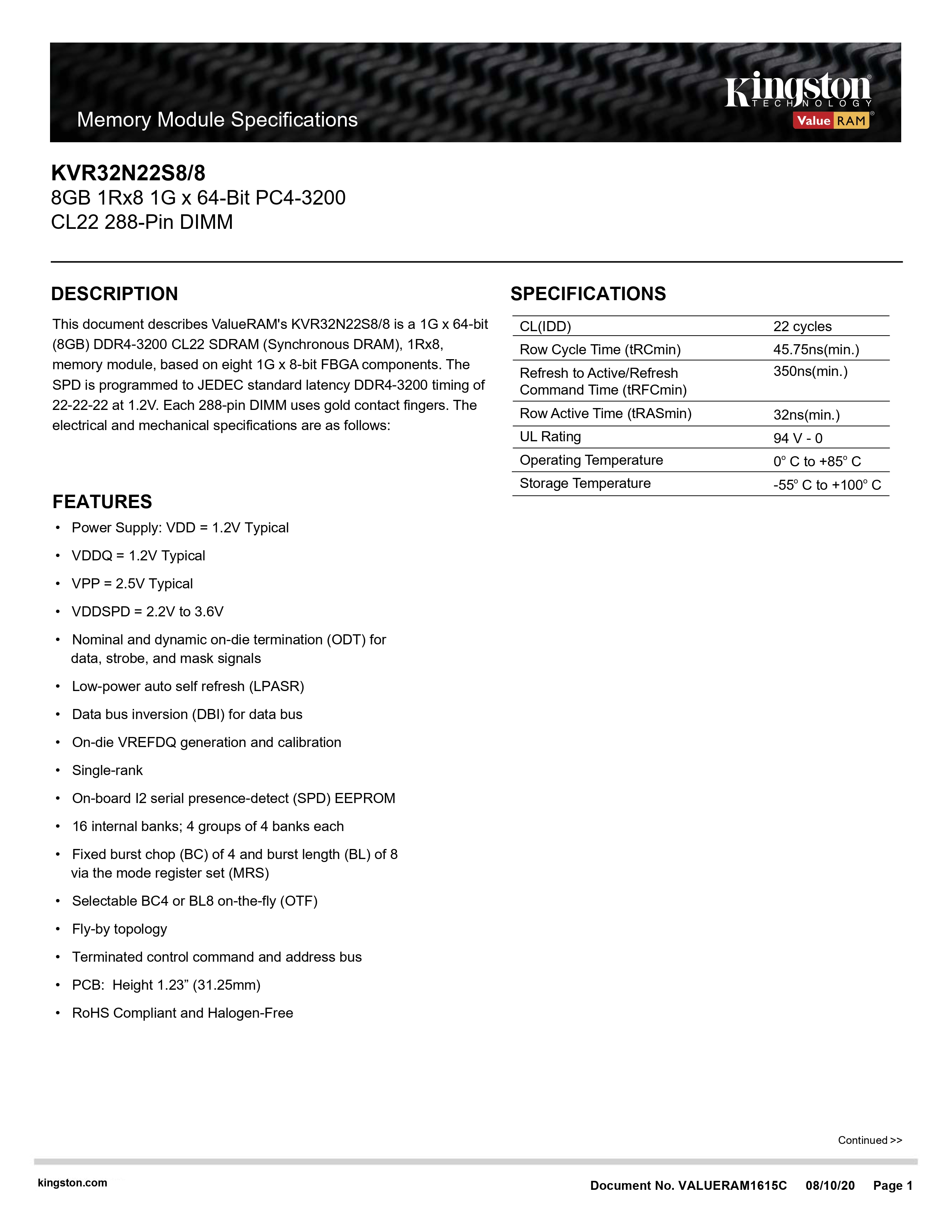 Kingston ValueRAM 8GB*1 DDR4-3200 CL22 LODIMM 記憶體(KVR32N22S8/8)