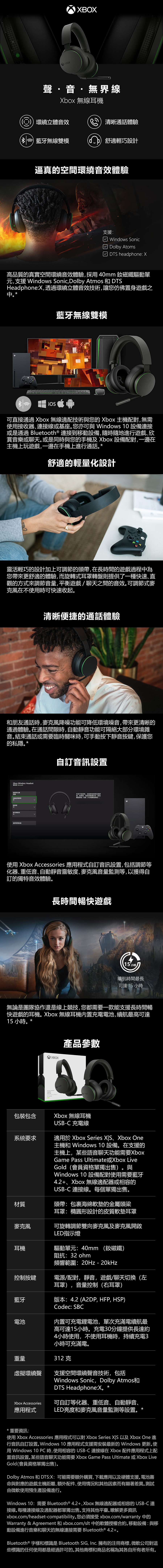 - 在 Xbox Series X|S 和 Xbox One 上支援空間音效技術,例如 Windows Sonic、Dolby Atmos 和 DTS Headphone:X