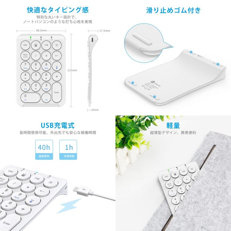 符合人體工程學的傾斜度降低了輸入時的壓力。背面有一個防滑墊,可以使它穩定。其設計易於輸入,即使長時間使用也不會給您帶來負擔,鍵帽编排易於輸入,很少輸入錯字的情況岀現。