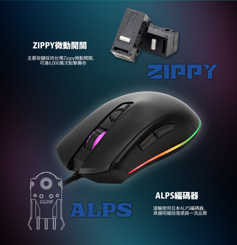 - 主要按鍵採用台灣Zippy微動開關,可達6000萬次點擊壽命