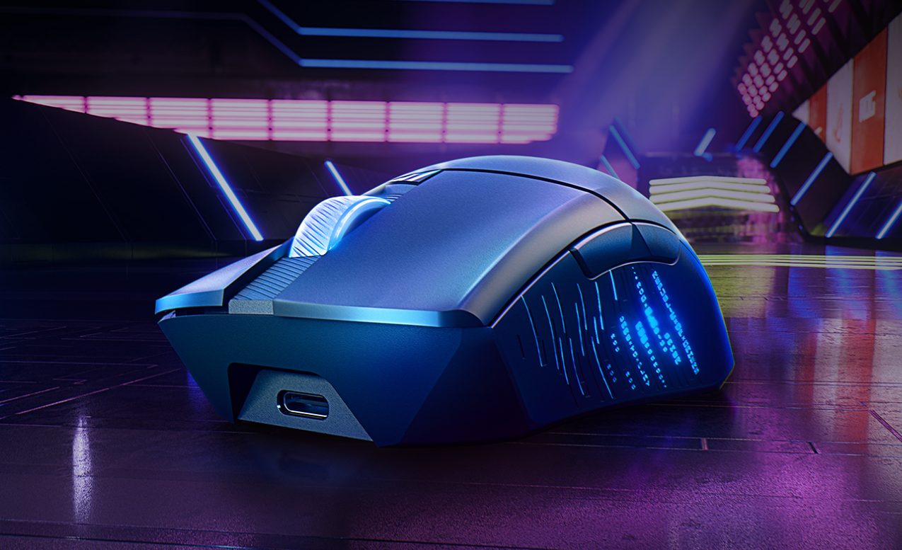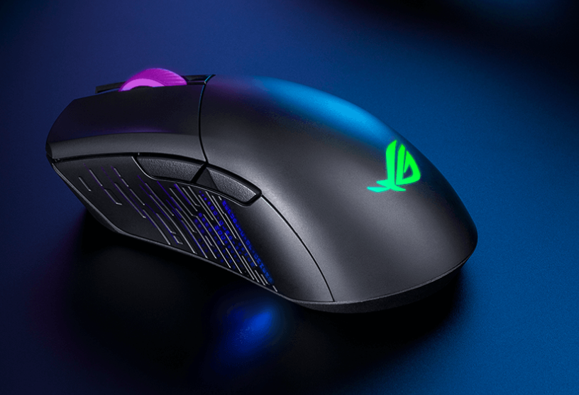 - 滑鼠側面的雷雕 ROG 圖紋具備 RGB 燈效