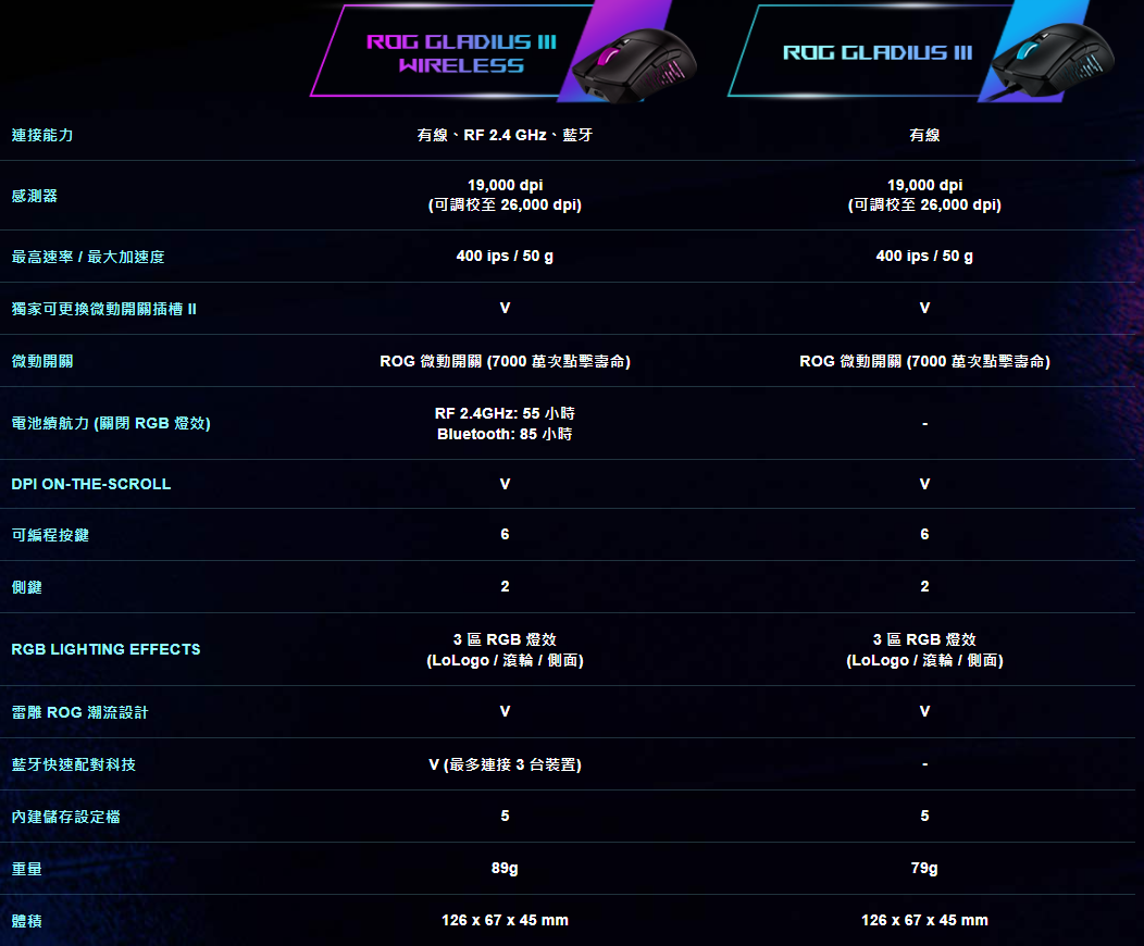 ROG Gladius III Wireless 具有三模連線功能 (2.4 GHz、藍牙、有線 USB 2.0) 及 19,000 dpi (1% 偏差並調校至 26,000 dpi),以提供接近零延遲與無可匹敵的精準度。其人體工學外型為長期遊戲提供舒適性,獨家可更換微動開關插槽 II 可確保相容於機械式與 Omron 光學微動開關。具備彈性 ROG Paracord 連接線與圓邊 100% TPFE 滑鼠腳,提供極為流暢的滑動,在滑鼠的防滑材質側身設有雷雕 ROG 圖紋,並搭載 RGB 燈效。