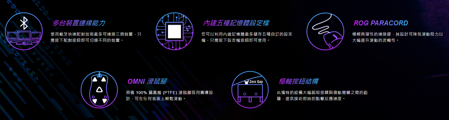 - ROG 微動開關提供穩定的點擊阻力與 7000 萬次點擊使用壽命