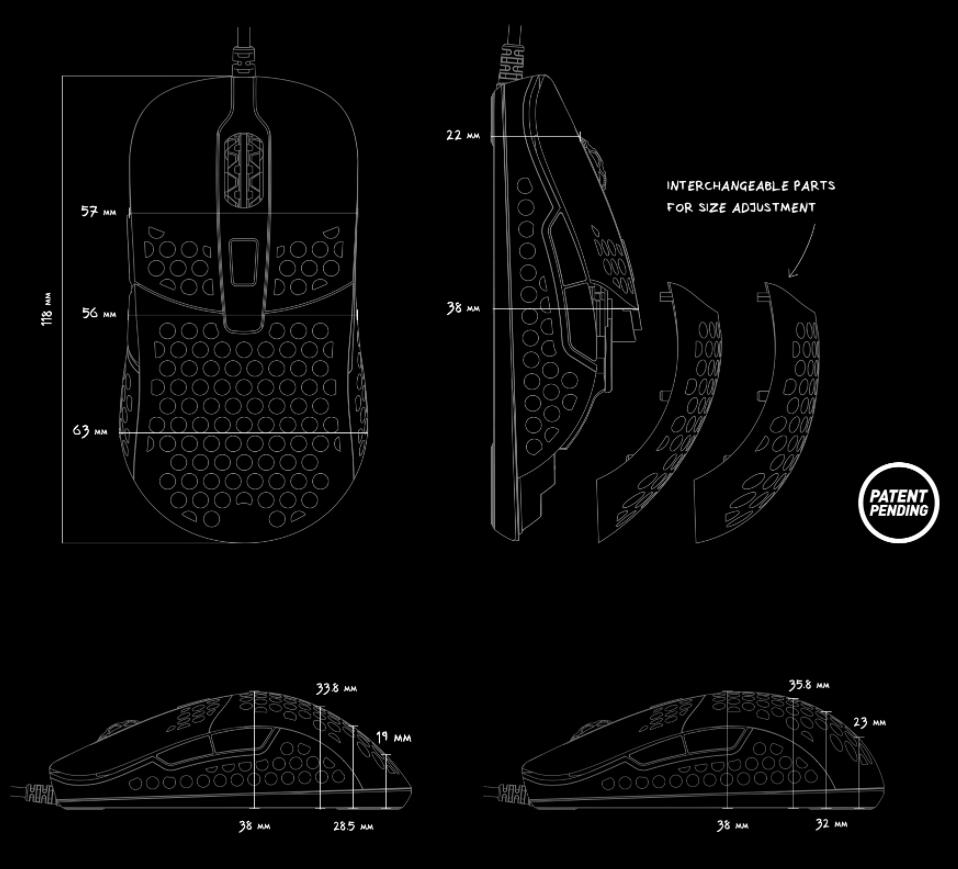 The M42 features 100 % PTFE skates with rounded edges for smoother glide, while its matte UV coating in combination with the hole structure make for a steadier grip. Enhancing airflow under your palm, the holes also help you stay comfortable.