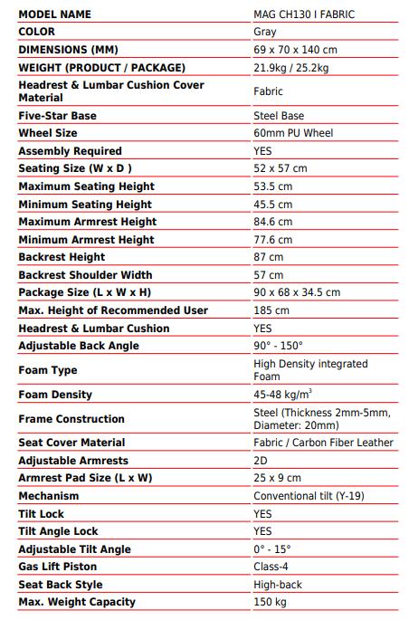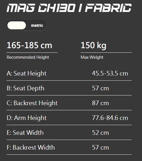 MAG CH130 I FABRIC 使用 4 級氣壓桿,提供更好的安全性。加上可調式頭枕和靠墊,舒適感極佳 ; 再搭配 60 mm 靜音PU 輪。