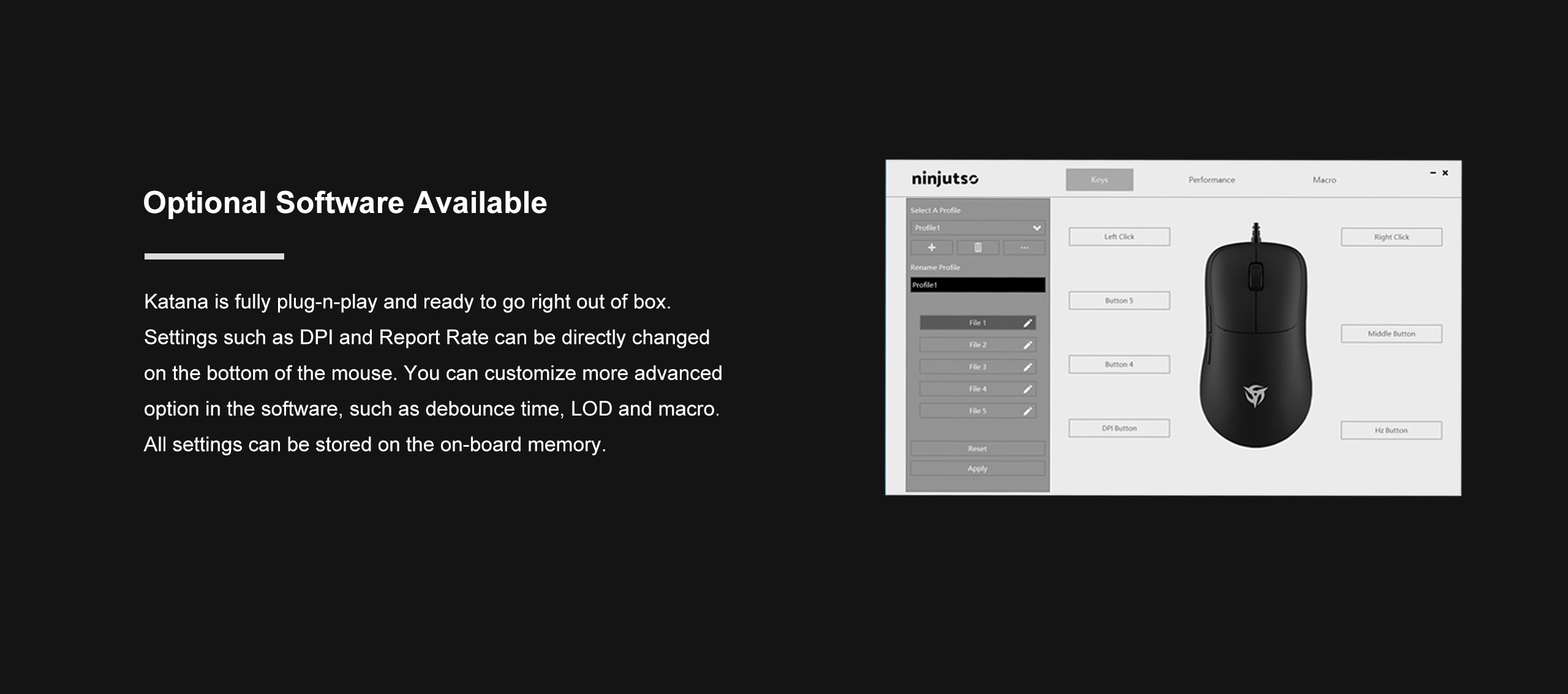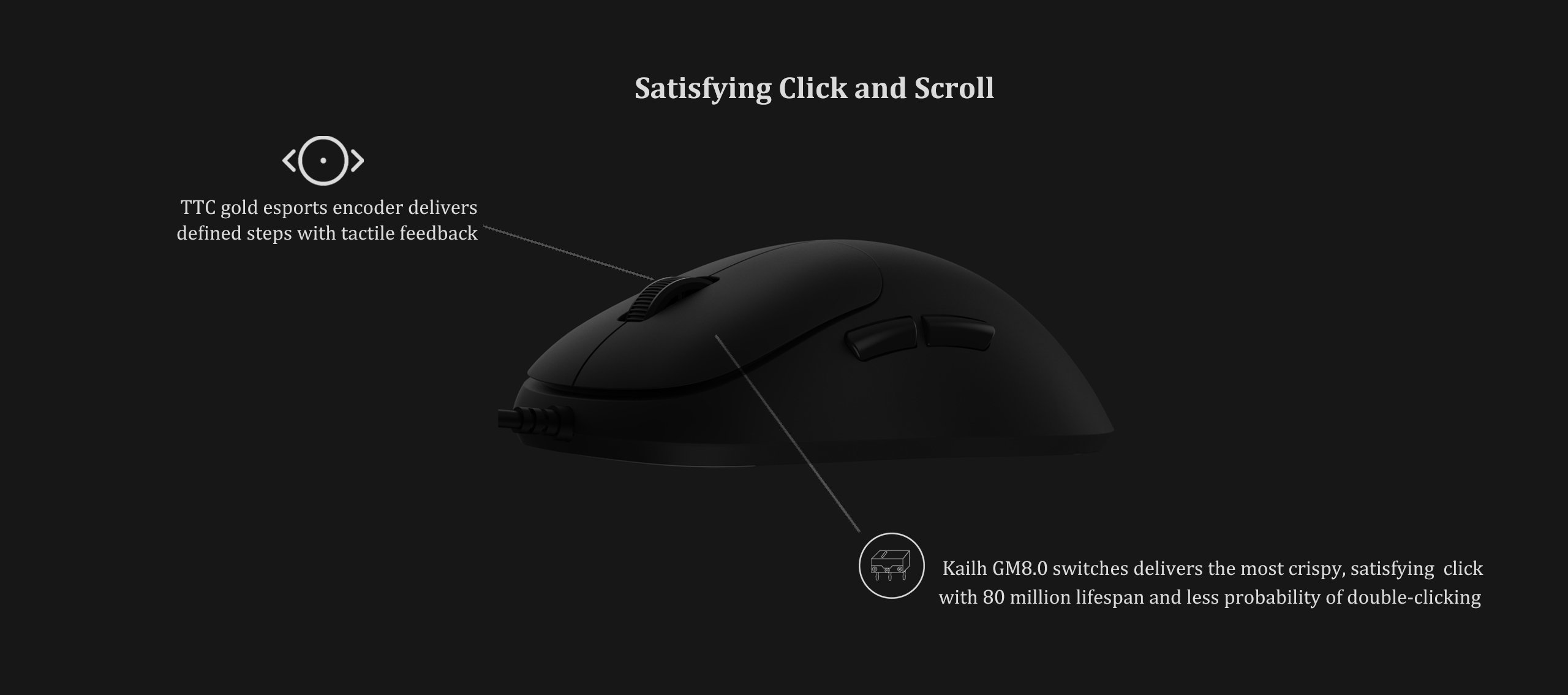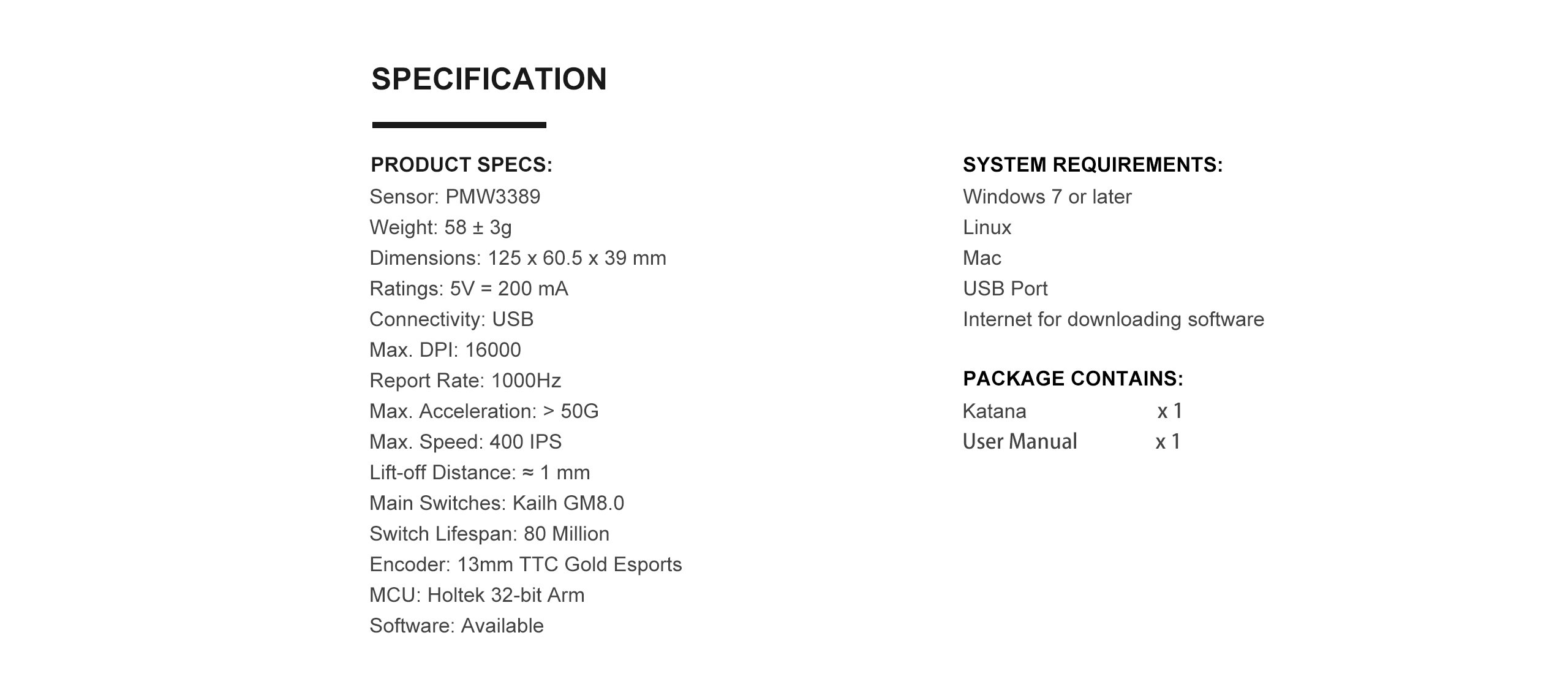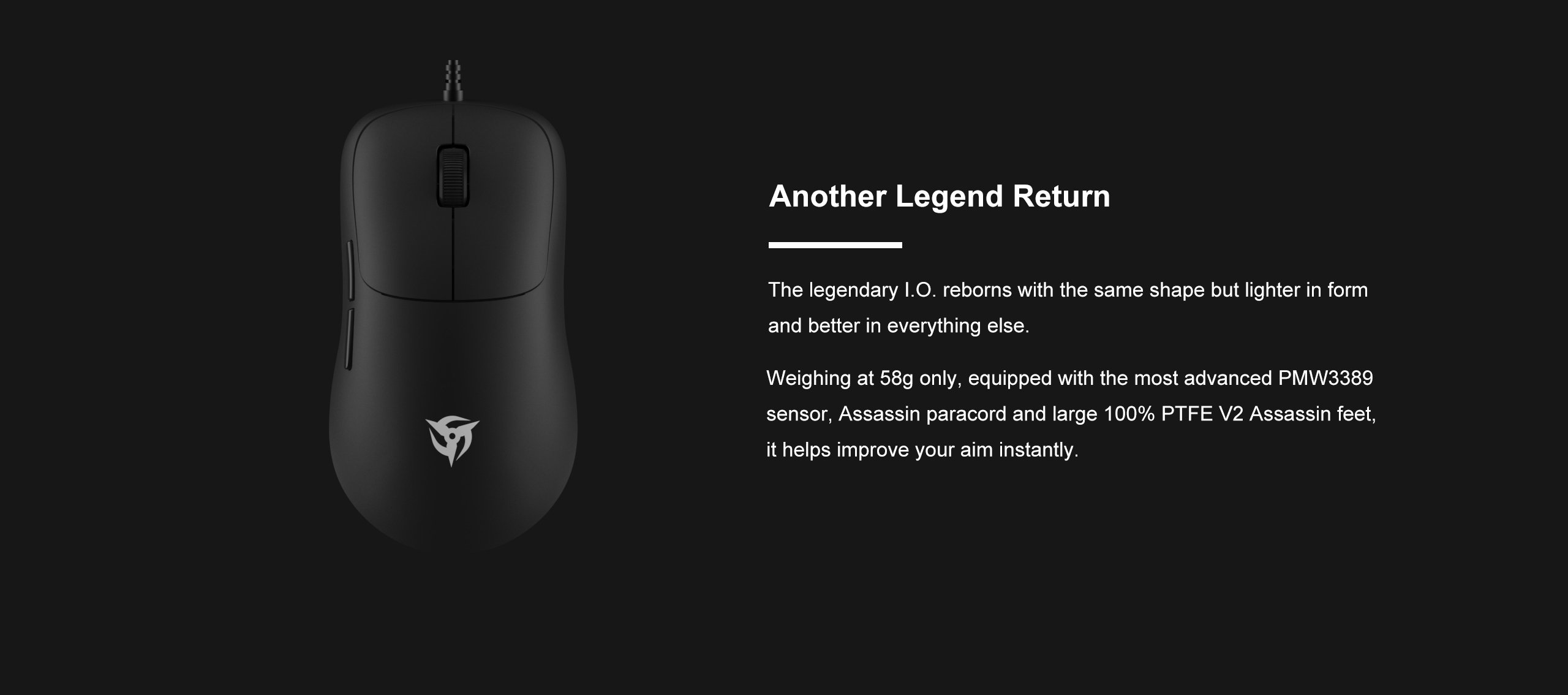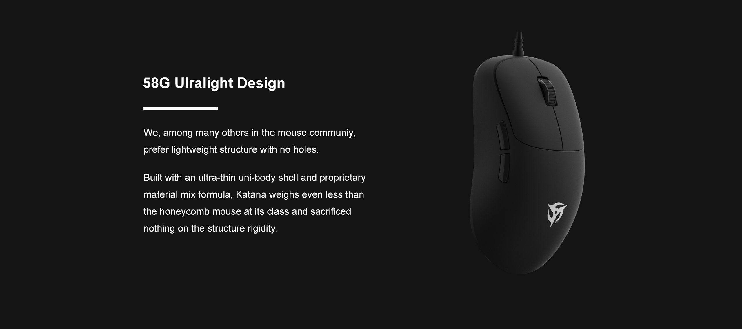 With the legendary IO inspired shape and 58g ultralight design, Katana is an esports ultra-lightweight gaming mice that’s designed to help improve your aim and dominate the battle. Packed with PMW3389 sensor, Assassin paracord, 100% PTFE feet and Kailh GM8.0 switch, everything is designed to satisfyingly take that nice shot.