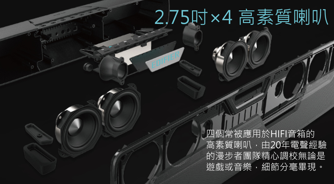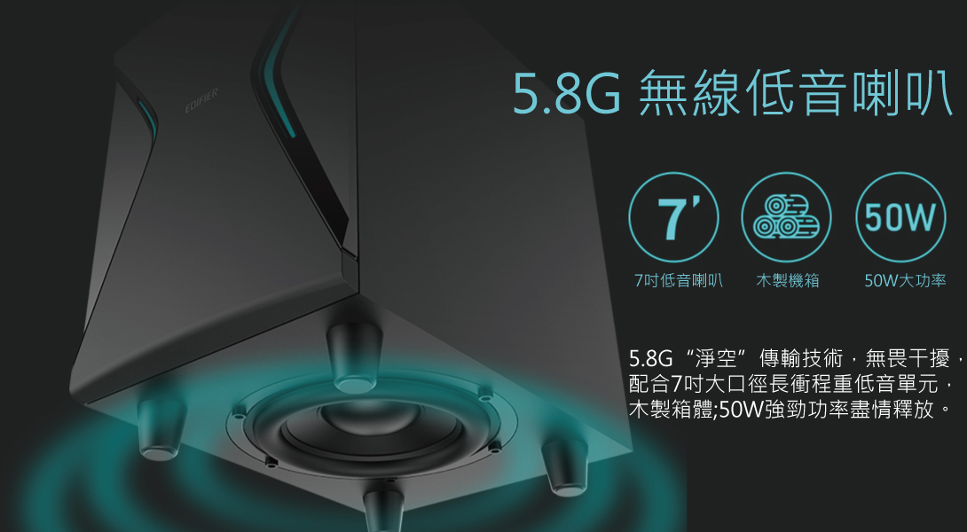 - 失真限制的輸出功率: 左/右聲道(高音):18W + 18W | 低音喇叭:50W