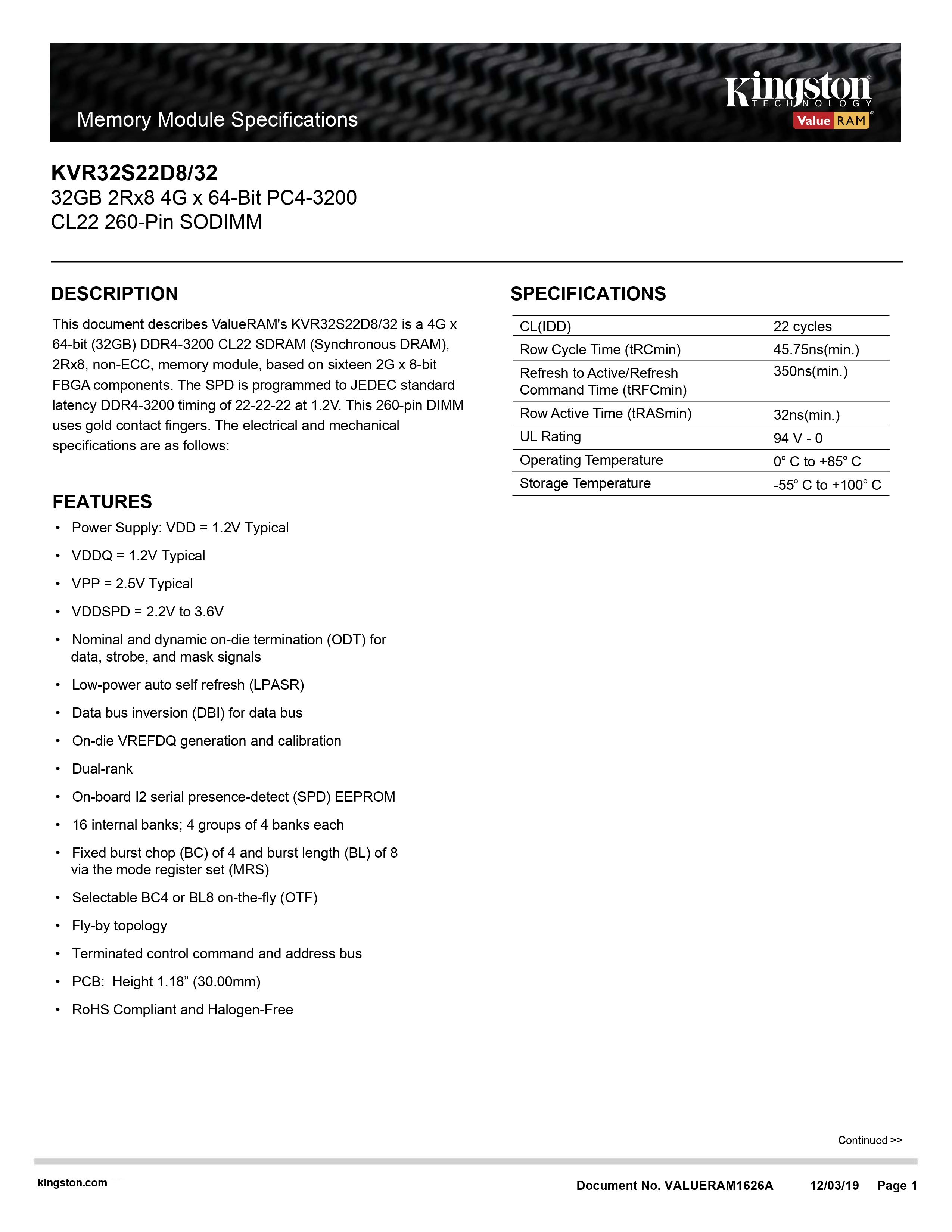 Kingston ValueRAM 32GB*1 DDR4-3200 CL22 SODIMM 記憶體(KVR32S22D8/32)
