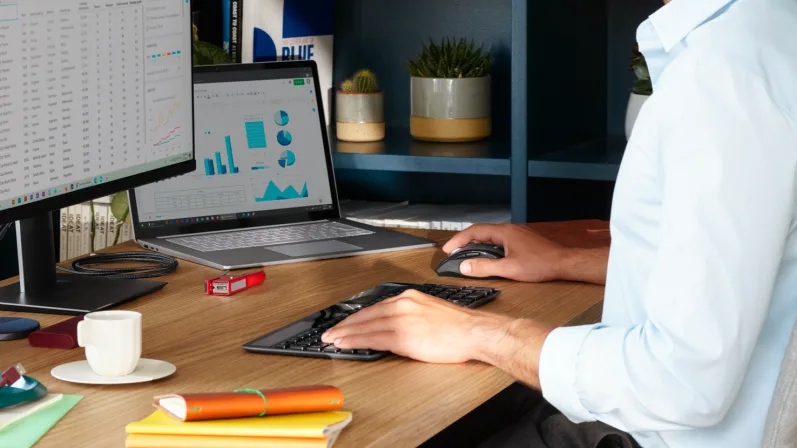 纖薄設計與全尺寸鍵盤同時兼具,一併擁有。整合的數字鍵盤讓輸入數字和移動變得輕鬆容易,而纖薄的外形使其可以和您的環境完美搭配,即使使用筆記型電腦也沒問題。