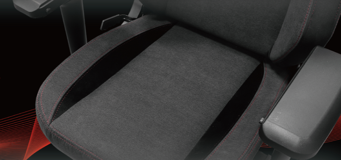 紅色縫線間隔開的黑灰防潑水布料與黑色絨毛相互搭配形成舒適雅致的外觀配色,並與其他產品不同,在外觀上捨棄多餘的花紋設計來追求極致的滑順,以提升更好的乘坐體驗。