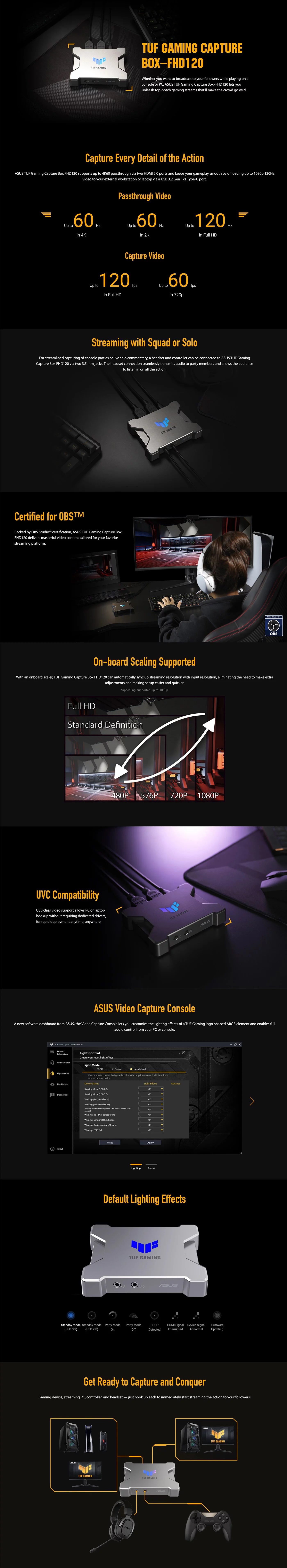 The compact, ready-to-stream ASUS TUF Gaming Capture Box FHD120 delivers 1080p 120Hz visuals with near-zero latency to captivate fans and followers.