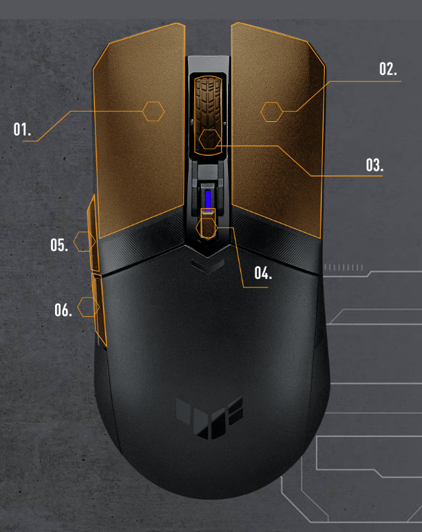 TUF Gaming M4 Wireless 具備 6 顆手感良好的可編程按鍵,讓您自訂控制功能以符合您的遊戲風格。分離式左右按鍵設計可降低觸發阻力與行程距離,以更快速、觸感更好的點擊動作。