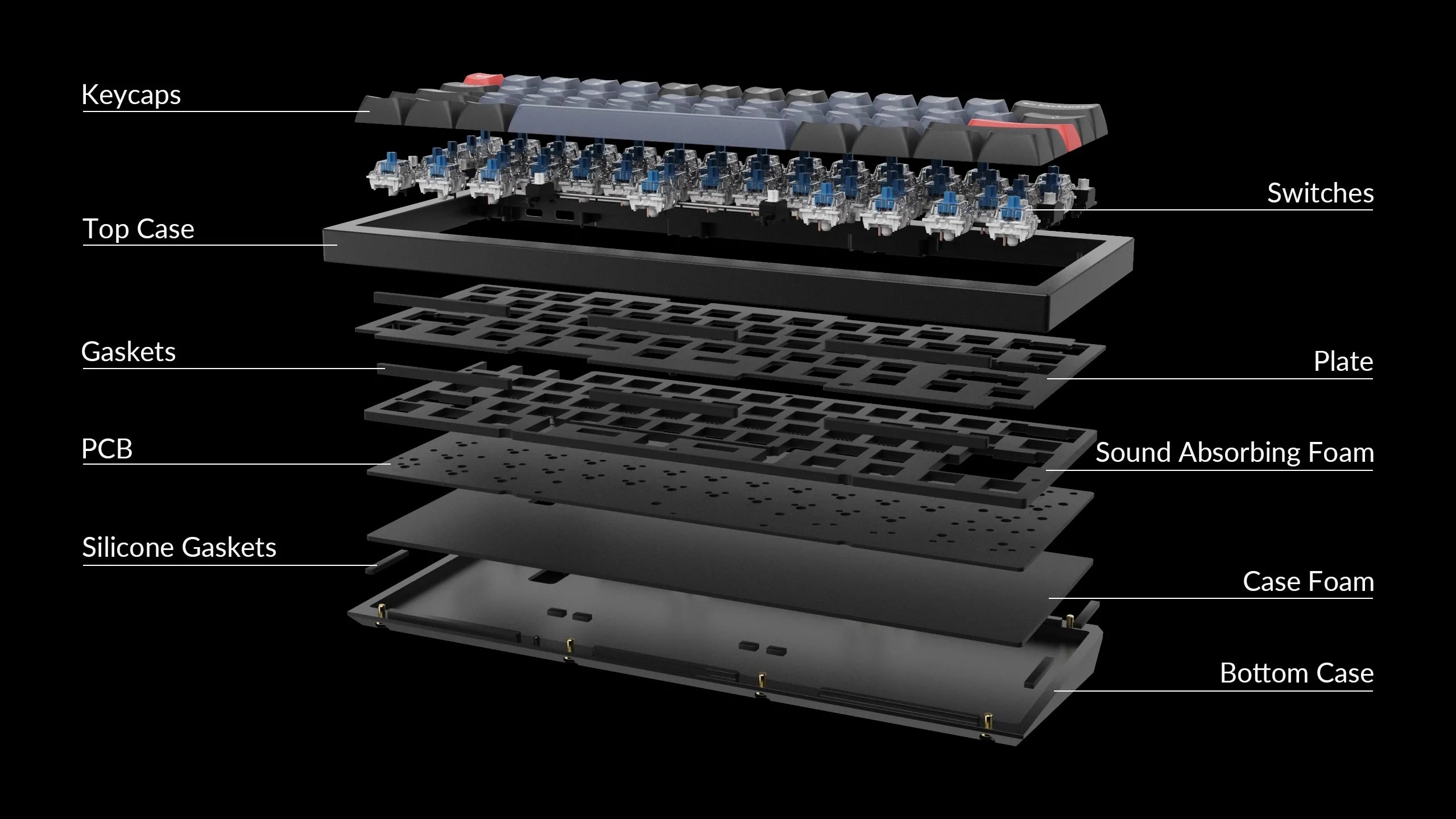 The Double Gasket Design is a new innovative structure in the industry. In addition to the gaskets on the plates, we added silicone pads between the top and bottom cases to significantly reduce the sound resonance between the metals and reduce the noise of the impacted metals. This design allows the keyboard to maintain the flexibility of the gasket structure and improves the overall typing sound.