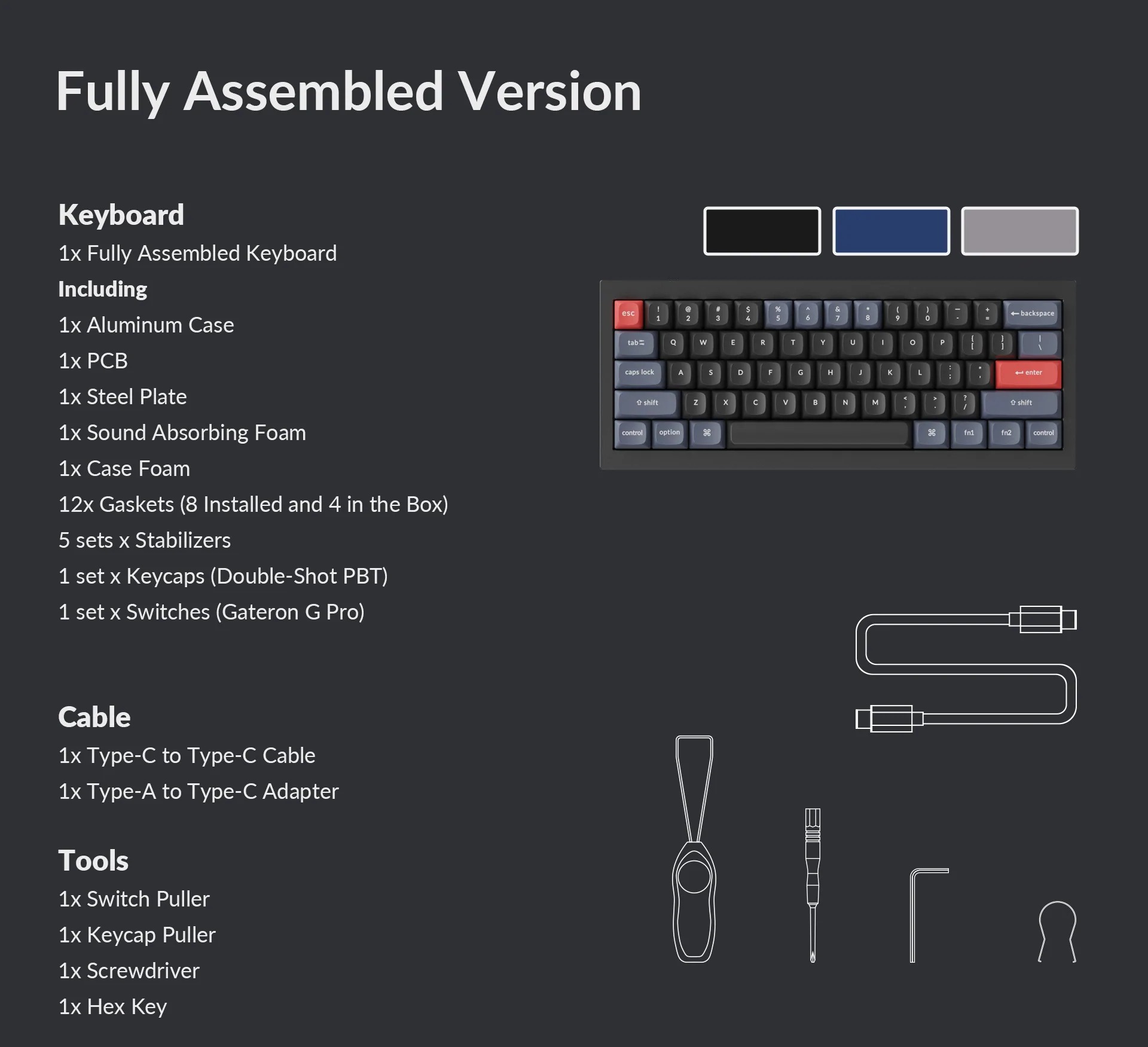 The optimized molded switch with more precise positioning and less wobble will undoubtedly improve the feel at your fingertips. With the fully assembled Q4 version fitted with factory pre-lubricated Gateron G Pro switches, a smoother travel experience is guaranteed for you.