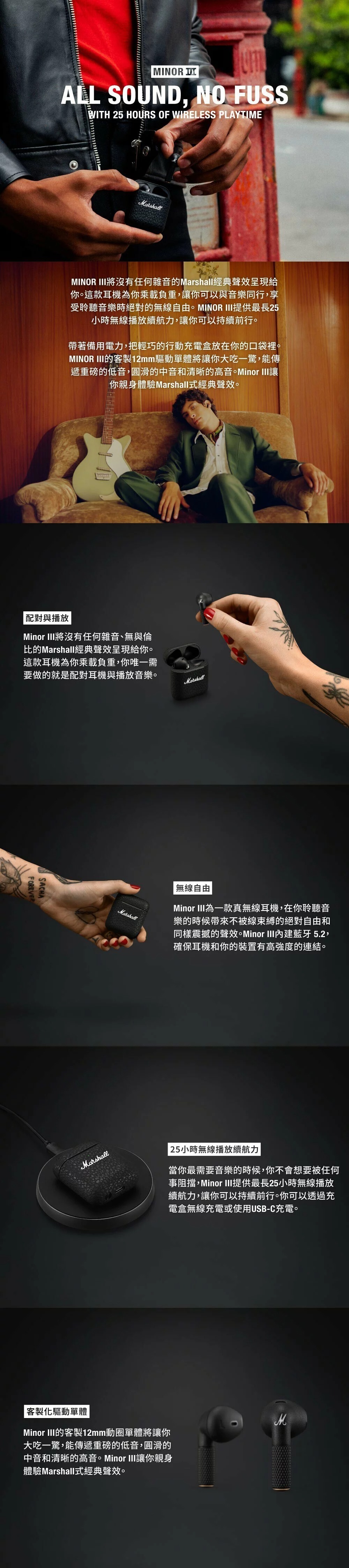 - Minor III 能無拘束地為你帶來 Marshall 標誌性聲音。這款耳機設有觸控式設計,能助你完成所有繁複的操作,你只需戴上耳機,配對設備,調整音量即可外出,盡情投入音樂世界。
