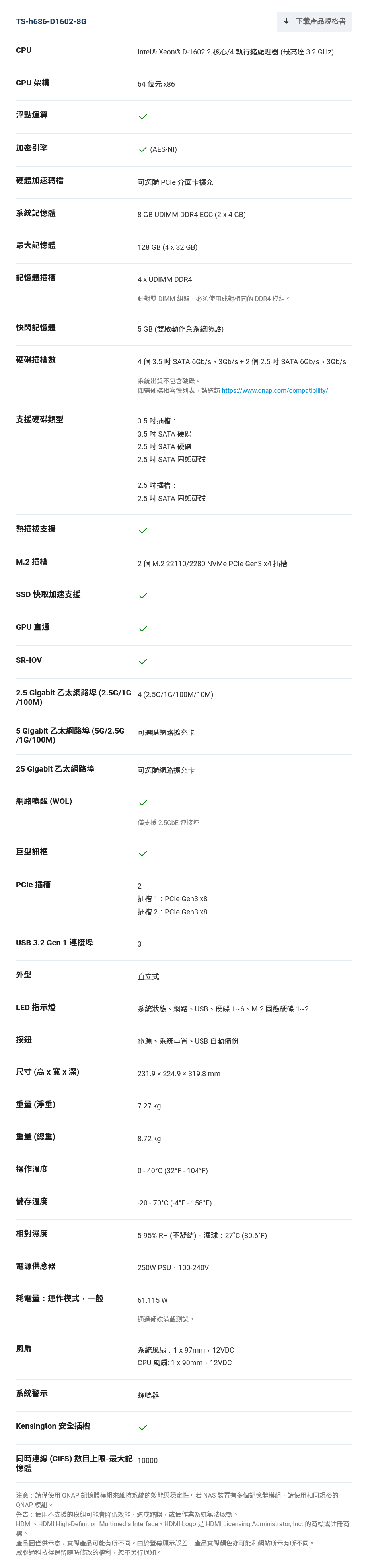 TS-h686 為高階企業提供效能精悍、價格經濟的 NAS 解決方案;桌上型設計適合沒有伺服器機房或有辦公室內資料共享需求的企業組織。TS-h686 搭載 Intel® Xeon® D 處理器與 DDR4 ECC (Error Correcting Code) 錯誤修正記憶體 (最高可達 128 GB),展現卓越效能兼顧系統穩定性;採用 ZFS 檔案系統的 QuTS hero 作業系統則重視資料完整性,支援強大的區塊層級資料重複刪除和即時資料壓縮、近乎無限的快照 (Snapshot)、即時快照同步 (Real-time SnapSync)、和讀寫兼備的多層快取等進階功能。無論是檔案伺服器、虛擬伺服器、影音編輯協作、以及高效檔案備份及異地備援等應用,TS-h686 皆能完美勝任,滿足企業重視高效率和穩定服務的要求。