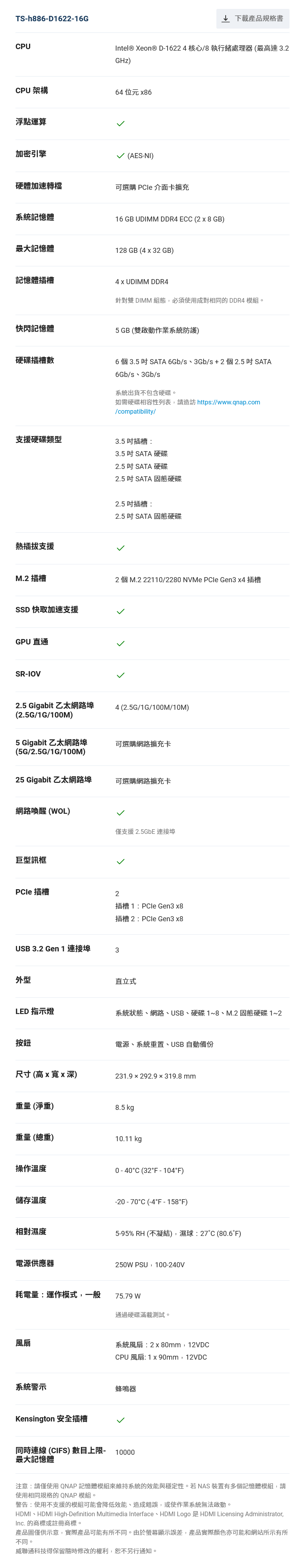 TS-h886 為高階企業提供效能精悍、價格經濟的 NAS 解決方案;桌上型設計適合沒有伺服器機房或有辦公室內資料共享需求的企業組織。TS-h886 搭載 Intel® Xeon® D 處理器與 DDR4 ECC (Error Correcting Code) 錯誤修正記憶體 (最高可達 128 GB),展現卓越效能兼顧系統穩定性;採用 ZFS 檔案系統的 QuTS hero 作業系統則重視資料完整性,支援強大的區塊層級資料重複刪除和即時資料壓縮、近乎無限的快照 (Snapshot)、即時快照同步 (Real-time SnapSync)、和讀寫兼備的多層快取等進階功能。無論是檔案伺服器、虛擬伺服器、影音編輯協作、以及高效檔案備份及異地備援等應用,TS-h886 皆能完美勝任,滿足企業重視高效率和穩定服務的要求。