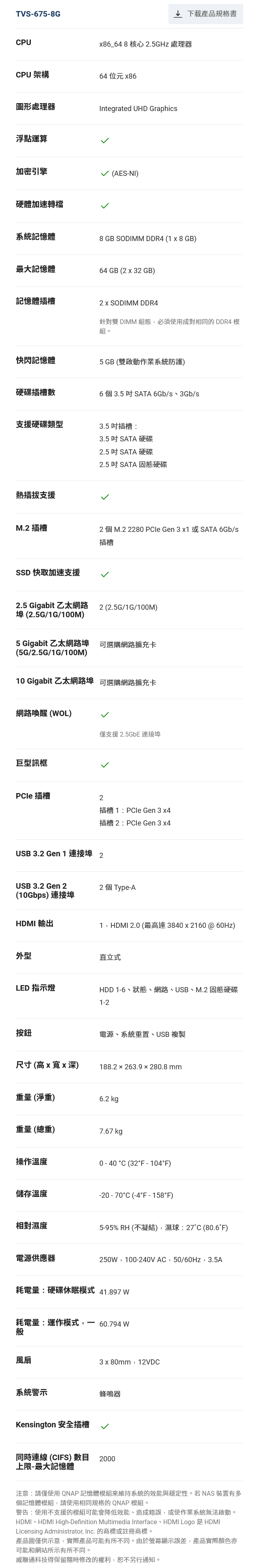 TVS-675 搭載 x86 架構八核心處理器,提供新世代企業導入 2.5GbE 儲存環境的理想選擇,以更高效率完成日常的資料備份、還原;內建的兩個 2.5GbE 網路埠更可支援 Port Trunking 網路聚合,提供高達 5 Gbps 的資料傳輸潛力。TVS-675 更配備 M.2 SSD 雙插槽可啟用快取加速,亦支援 PCIe 彈性擴充、多雲備份、以及 4K HDMI 2.0 輸出與影音即時轉檔,儲存空間和 App 應用皆可彈性擴充,是高性價比、高安全性的資料儲存及多媒體應用 NAS 方案。