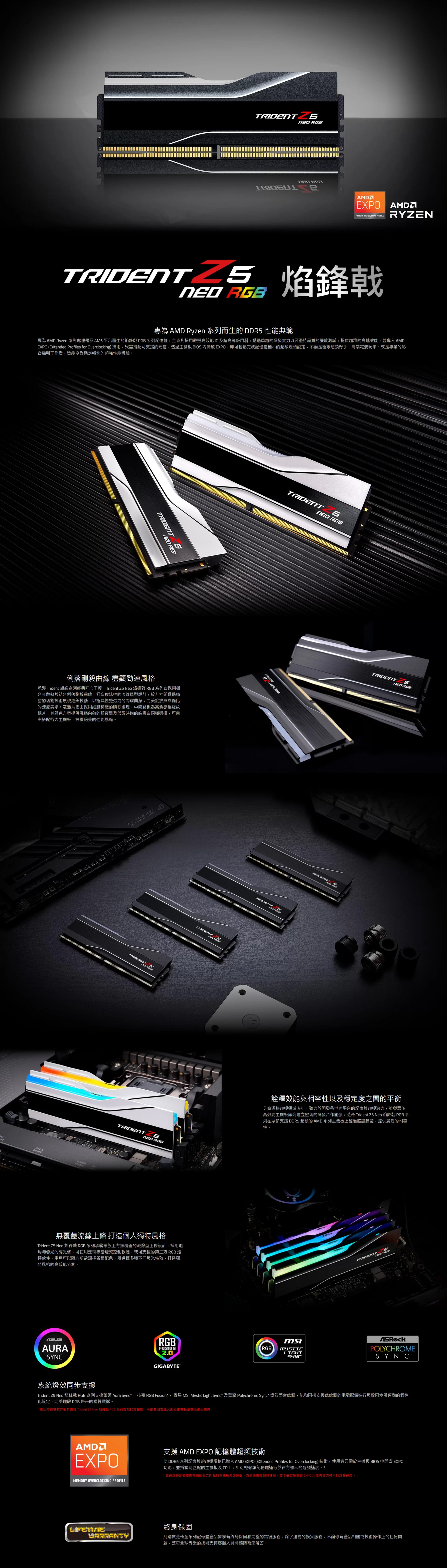 - Trident Z5 Neo RGB 系列,專為 AMD 600/800 系列晶片組設計,搭載 AMD Ryzen 7000/8000G/9000 系列 CPU
