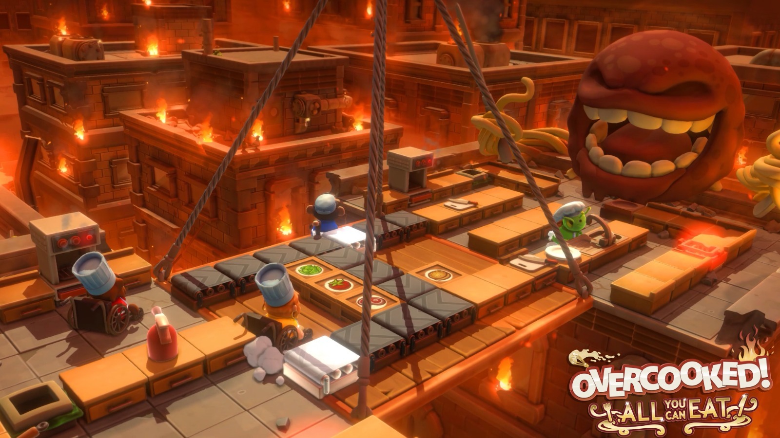 •    眾多的多人關卡 — 元祖的《胡鬧廚房》首次可以進行線上多人連線,在《胡鬧廚房 全都好吃》裡,所有收錄的關卡都可以支援多人合作。