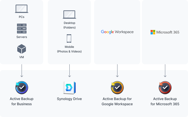 Active Backup Suite 可以整合及自動化 PC、檔案伺服器、VM、SaaS 應用程式等的備份任務。透過集中式入口,遠端管理裝置備份,快速還原特定檔案或整個裝置,確保營運不中斷。內建遠端備份解決方案可實現完善的 3-2-1 備份計畫。