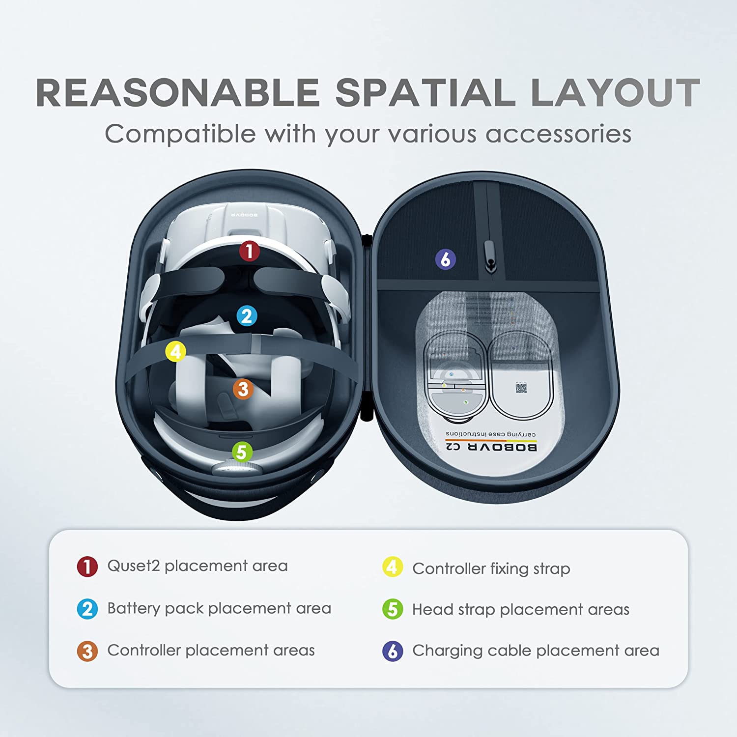 專為 Oculus Quest2 和 BOBOVR M2 設計的C2 收納包具有高相容性及大容量的存儲空間。相容於官方 Elite頭戴和各種類型的頭戴 ,只要頭帶的高度小於 15 釐米,都可將其放入。 C2 收納包採用簡潔的設計,與原始Oculus Quest2的設計風格完全一致,同時考慮到外觀設計和實用功能。 保護套表面以美麗的紋理布料材質製成,採用 6.5 公釐厚的 EVA 材質,卵石形狀,防摔、防撞、防塵、濺水,更好地保護您的Oculus Quest2 。