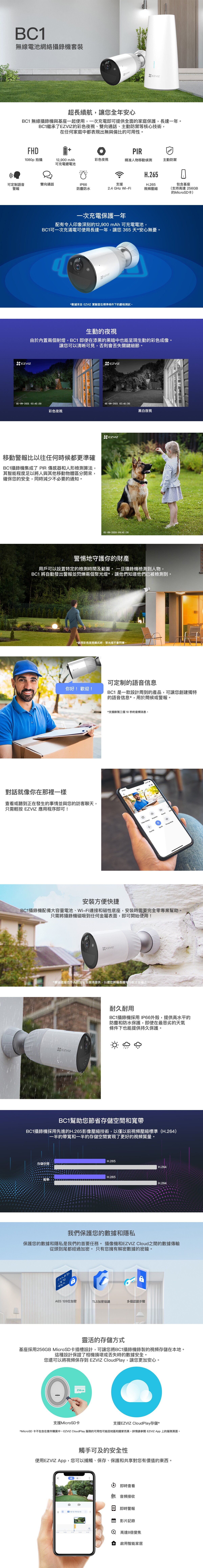 - BC1無線攝錄機,大容量12,900mAh電池可充電電池為家庭提供長達一整年使用,彩色夜視、雙向通話、主動防禦、PIR傳感器和人形檢測算,IP66,H.265