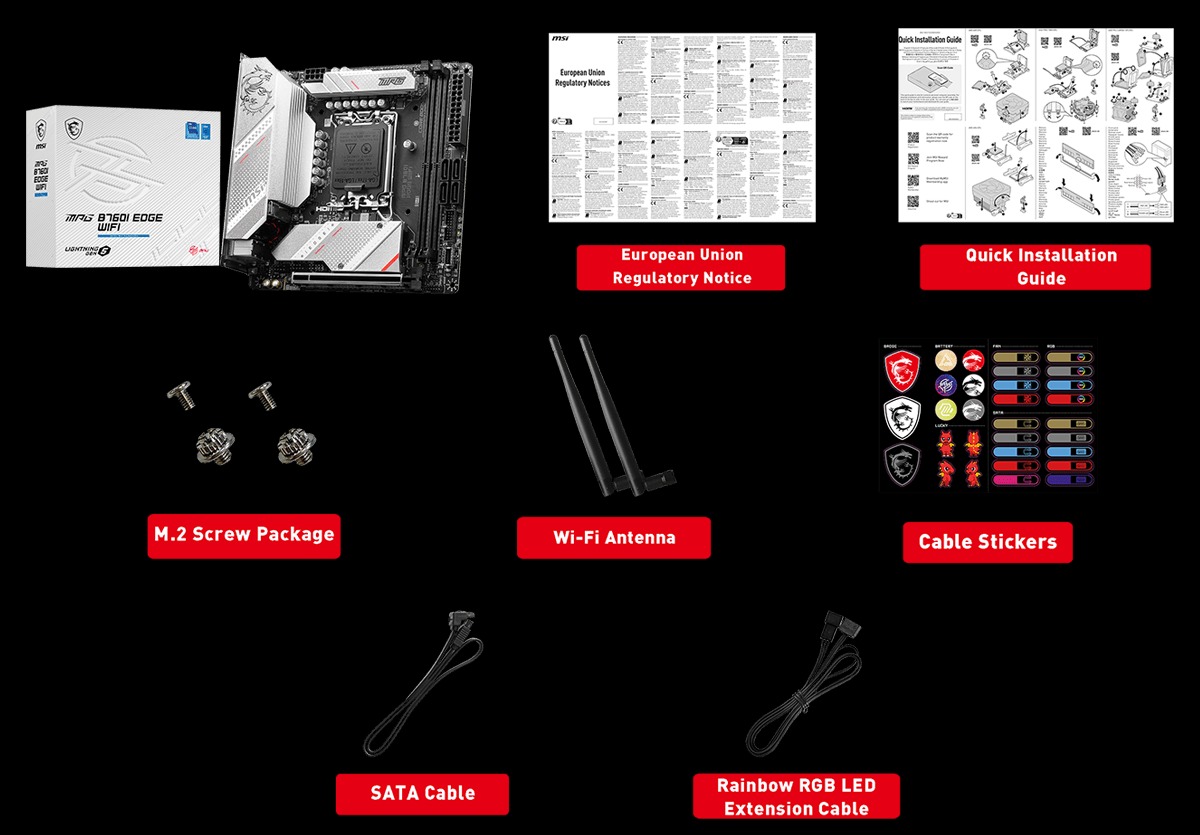 USB 3.2 Gen 1 5GbpsDisplay PortUSB 3.2 Gen 2 10Gbps2.5G LANAudio ConnectorsHDMI™USB 3.2 Gen 2 10Gbps (Type-C)USB 2.0Wi-Fi / Bluetooth |