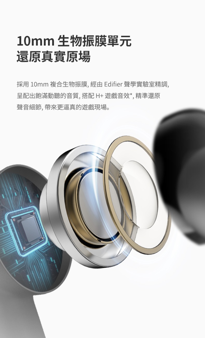 - 10mm 動態驅動單元,具有音樂和遊戲聲音模式,滿足不同需求