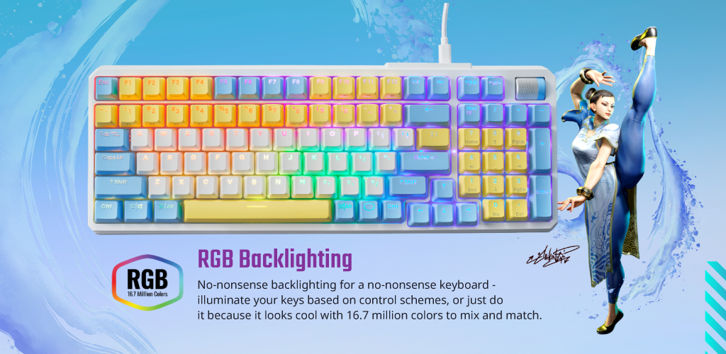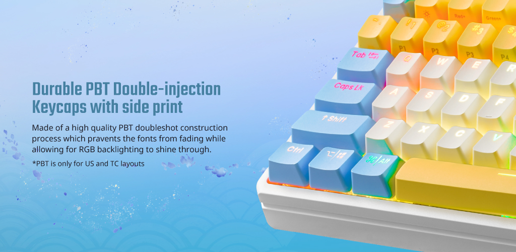 - 鍵盤鍵帽:PBT 雙色鍵帽,附雷射列印。