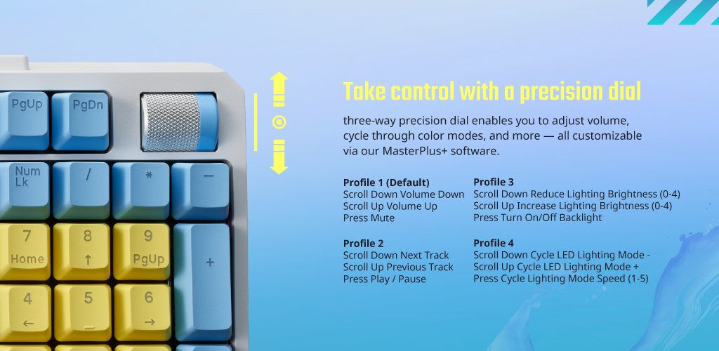 - 金屬三向滾輪鍵,在四種配置文件中有不同的作用
