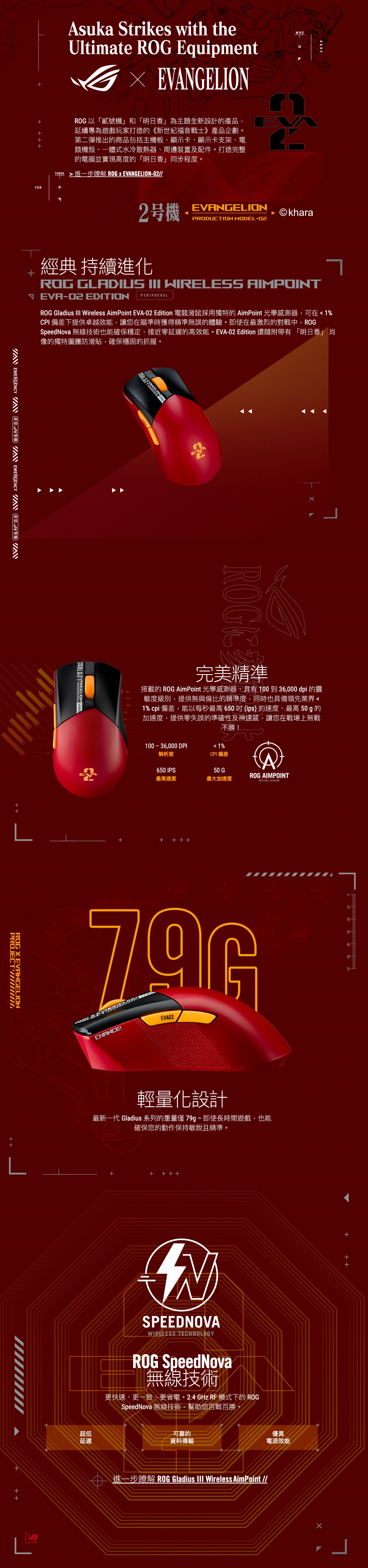 ROG Gladius III Wireless AimPoint EVA-02 Edition 是一款 79g 無線電競滑鼠,配備 36K-dpi ROG AimPoint 光學傳感器、三模連線、ROG SpeedNova 無線技術、可更換微動開關插槽、ROG 微動開關、ROG Paracord、 100% PTFE 滑鼠腳及圖騰防滑貼