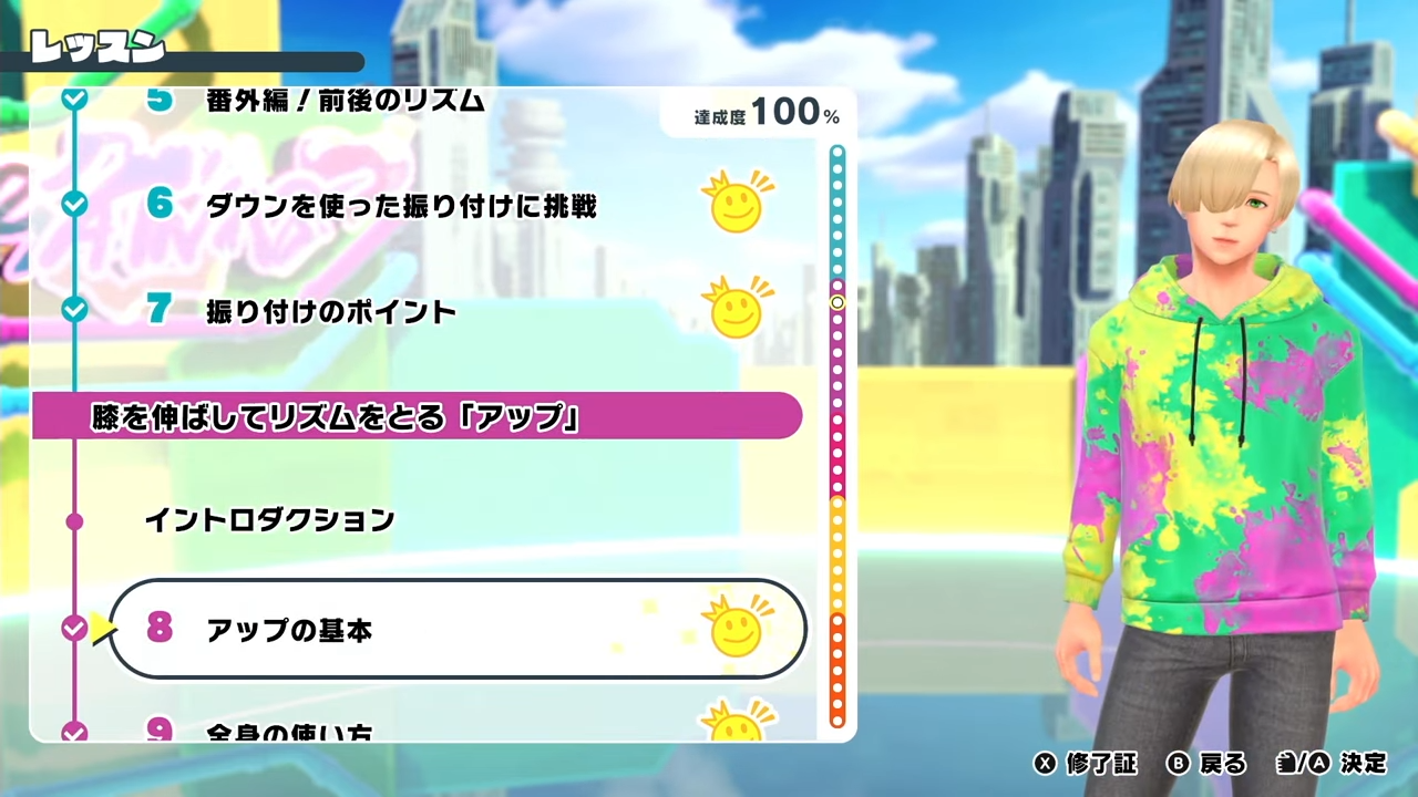 官方表示,本作是以「初學者也能跳舞」為概念的正式舞蹈教學遊戲軟體。雙手拿著 Joy-Con,按照教練的指示跳舞,不僅可以學習舞蹈的基礎,還可以學習帥氣的舞蹈技巧。課程裡有「往下」、「往上」等舞蹈動作,由 30 個階段組成,課程會逐步升級,即便是初學者也能放心的開始學習。