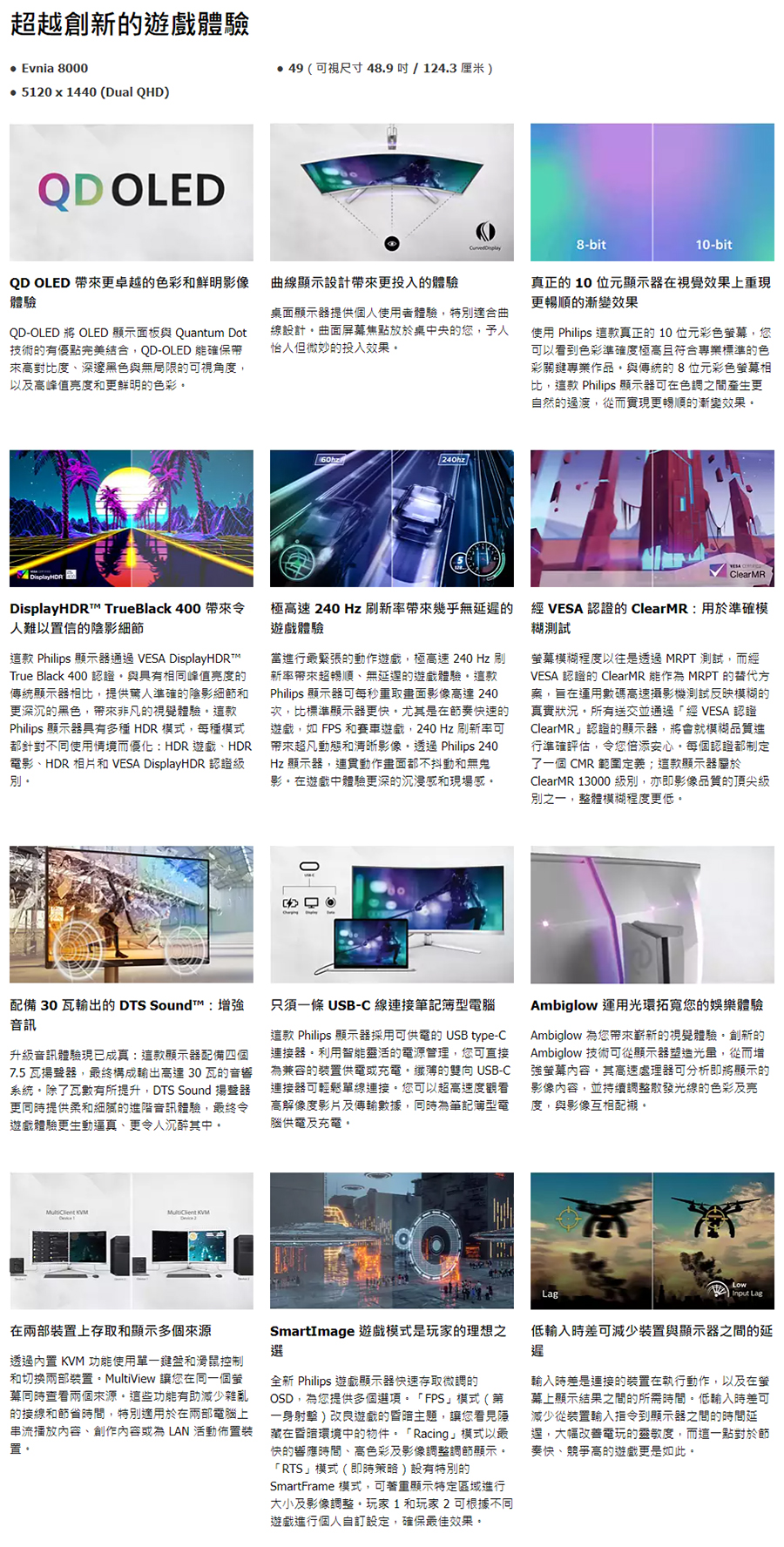 透過這款顯示器能夠產生驚人對比度的 QD OLED 螢幕、32:9 曲面 SuperWide 畫面及可以為每個遊戲設定房間氣氛的獨有 Ambiglow 功能,提升您的遊戲體驗。