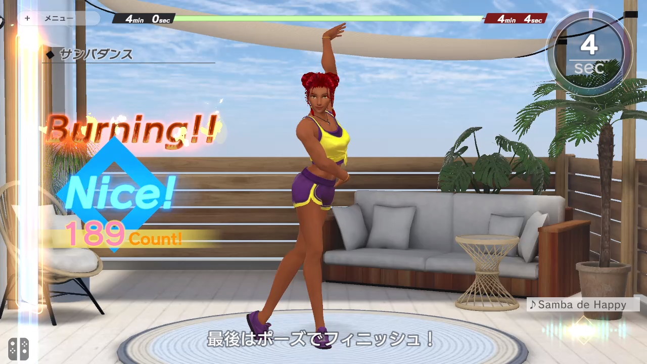 而在另一種的節奏健身裡,則準備了配合音樂來活動身體,這種負擔較輕的訓練內容,但仍有望替使用者帶來高燃脂效果。所收錄的有氧運動為八種有氧健身操,四種以拳擊練習為中心的打鬥,以及爵士舞及桑巴等 8 種舞蹈,合計共 20 種。也加入了如 Para Para 舞及打藝(御宅藝)等舞蹈。