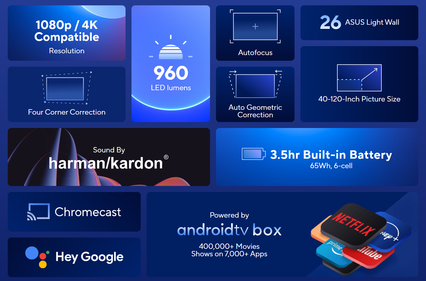 - 960 LED 流明輸出和全高清原始分辨率,以及 4K 相容性