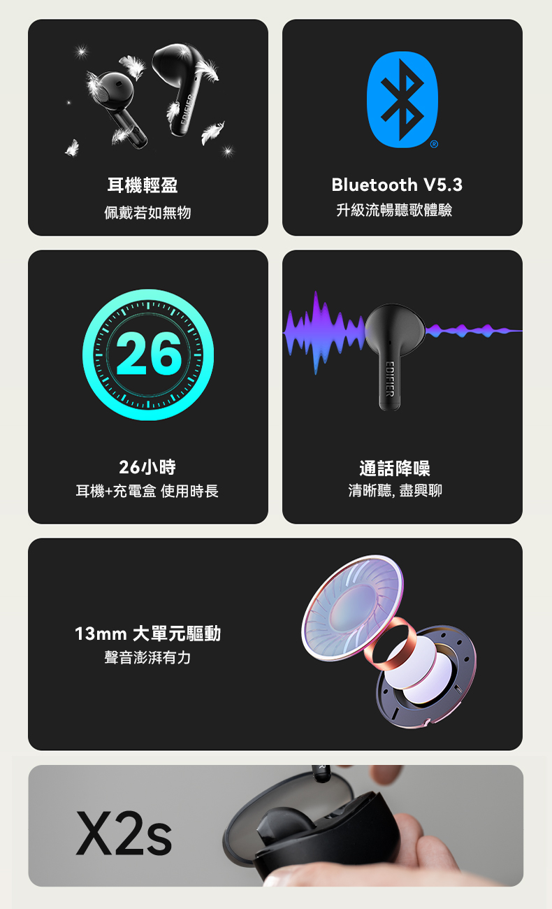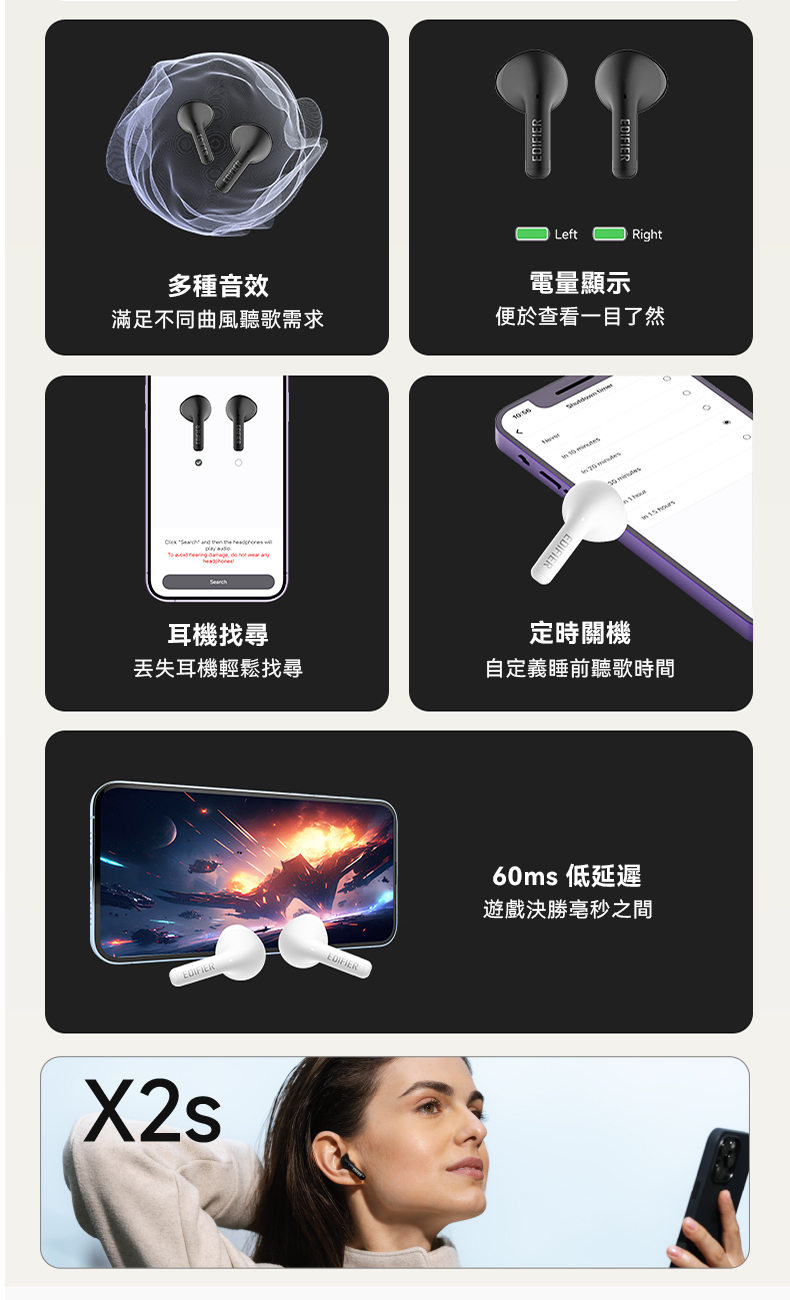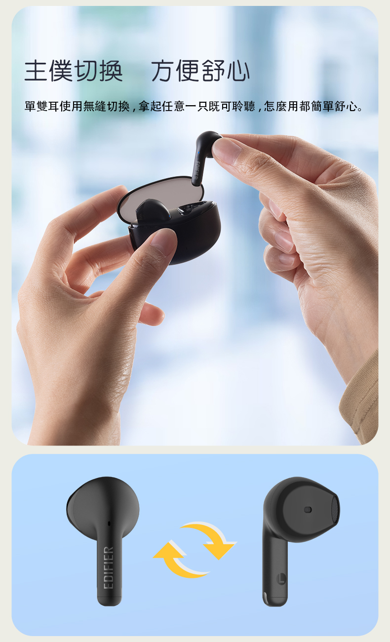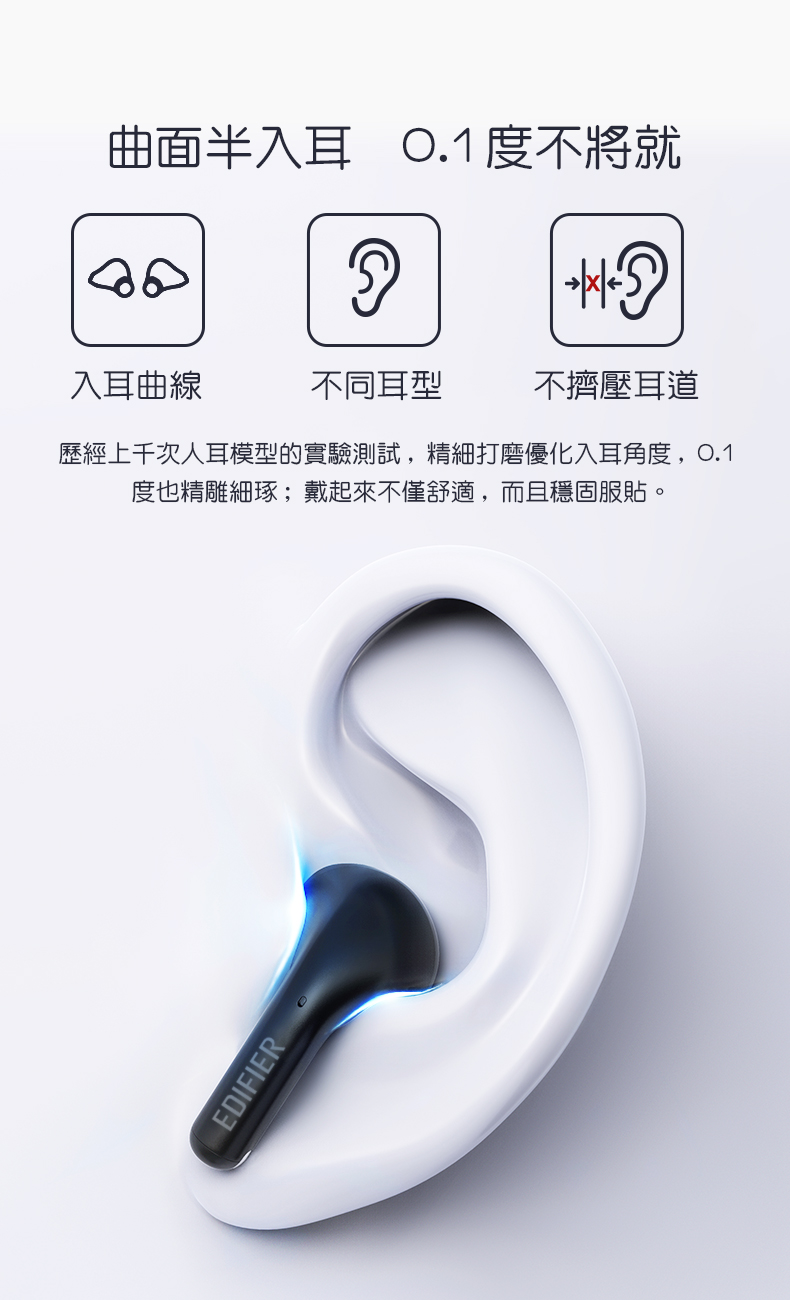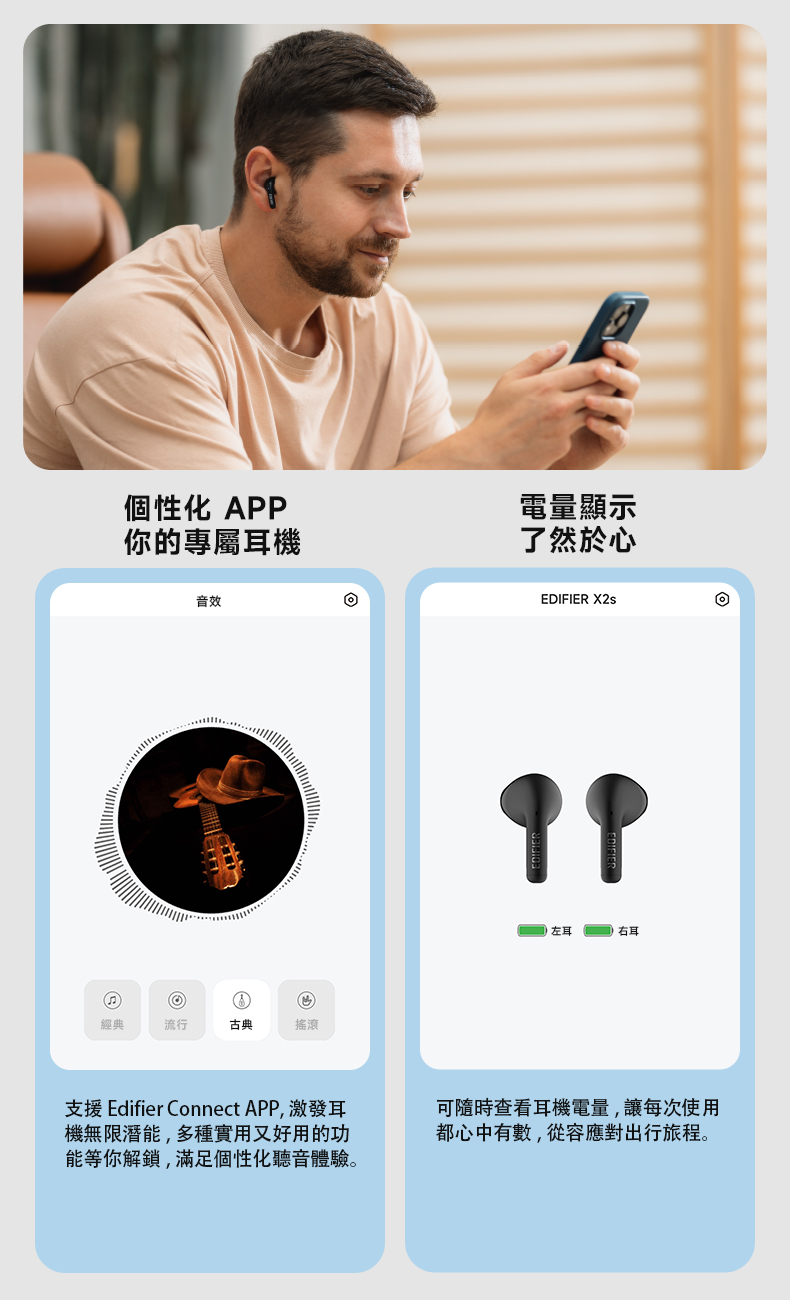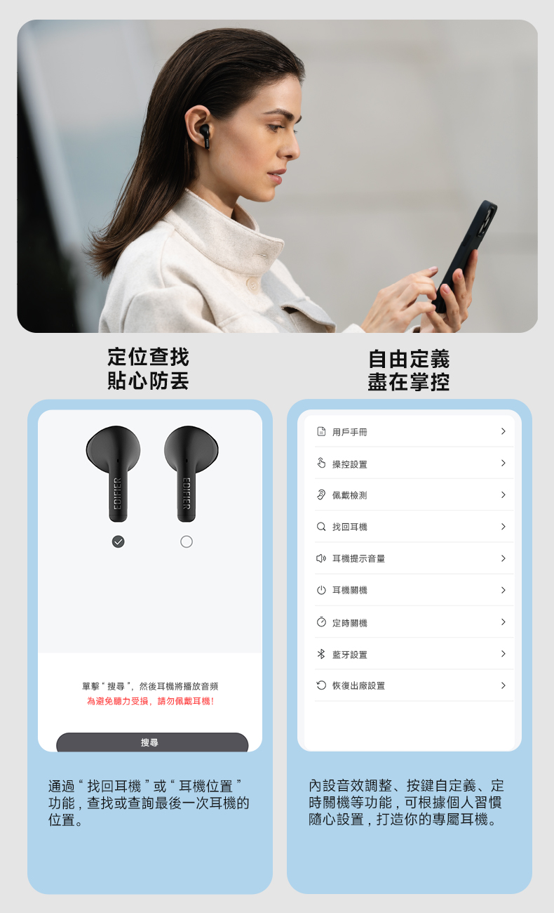 - 通過 Edifier Connect App 可自定義控制設置、查找耳機和EQ選擇