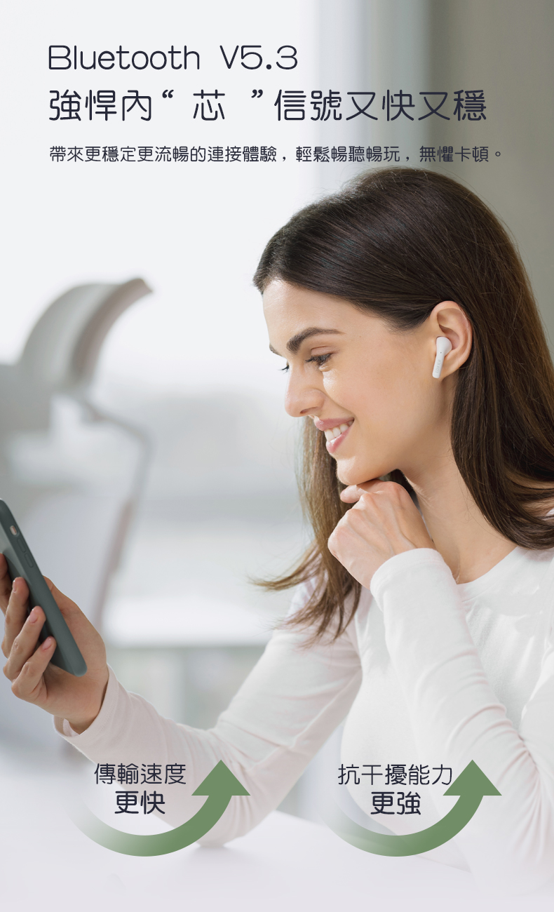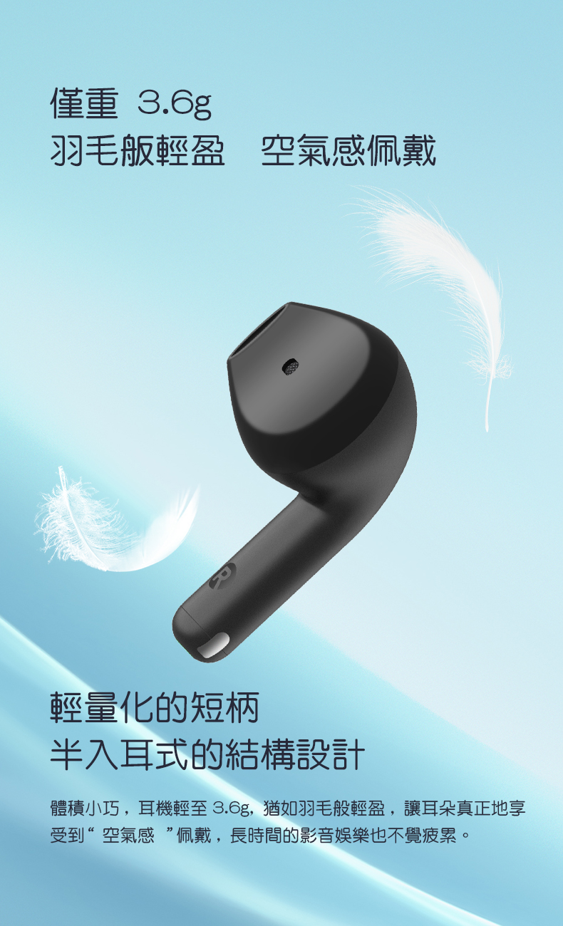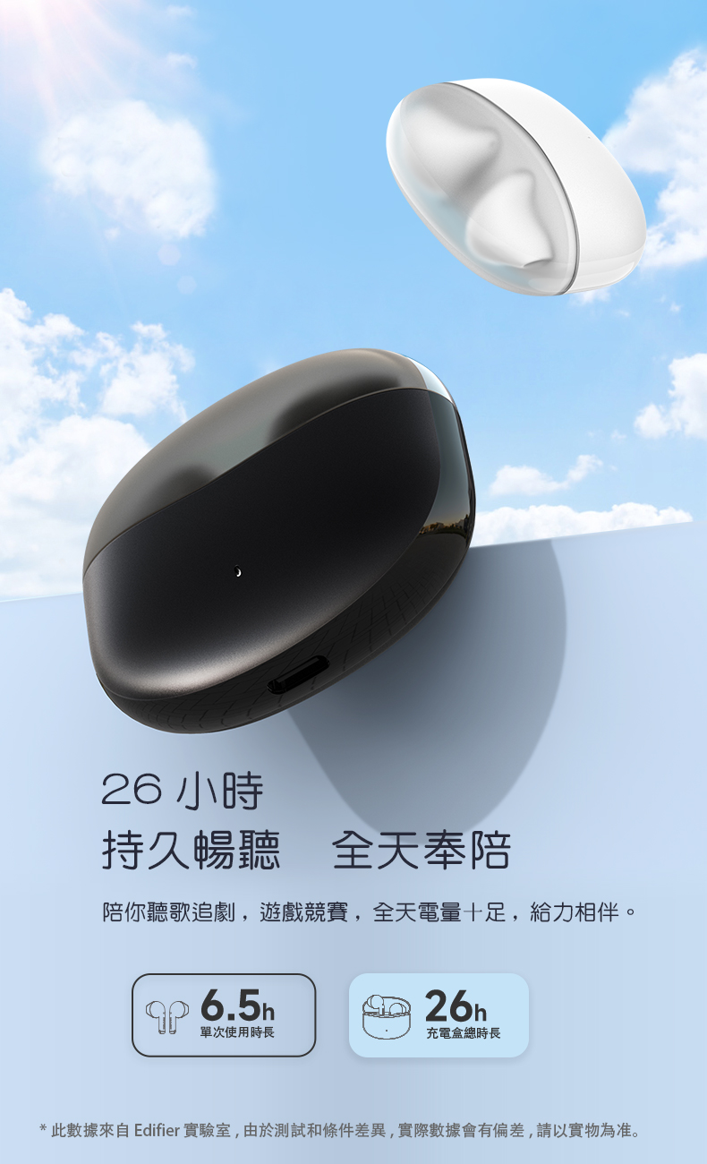 - 耳機約: 6.5h + 充電盒約: 19.5h; 總使用時長約: 26h