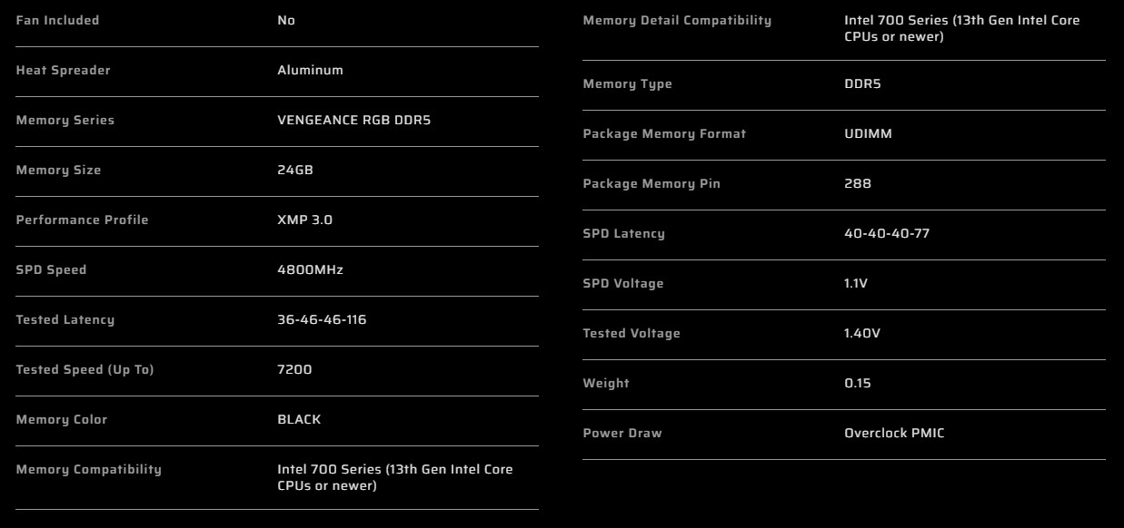 Corsair VENGEANCE RGB PRO DDR5-7200MHz 48GB (24GB x2) CL36 BLACK(CMH48GX5M2B7200C36)