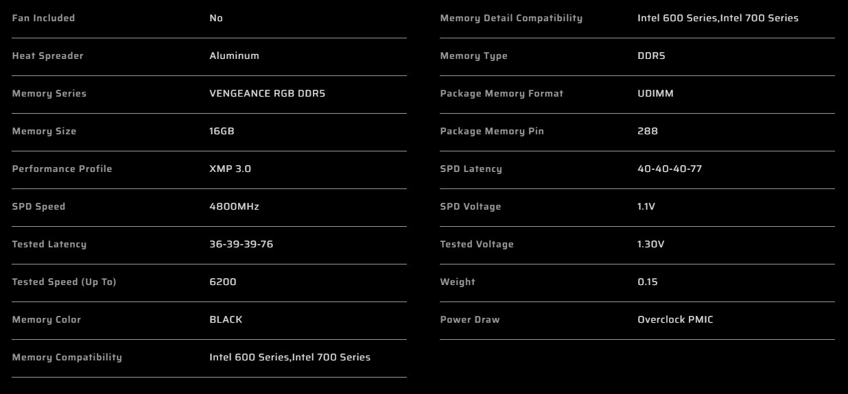 Corsair VENGEANCE RGB PRO DDR5-6200MHz 32GB (16GB x2) CL36 BLACK(CMH32GX5M2B6200C36)