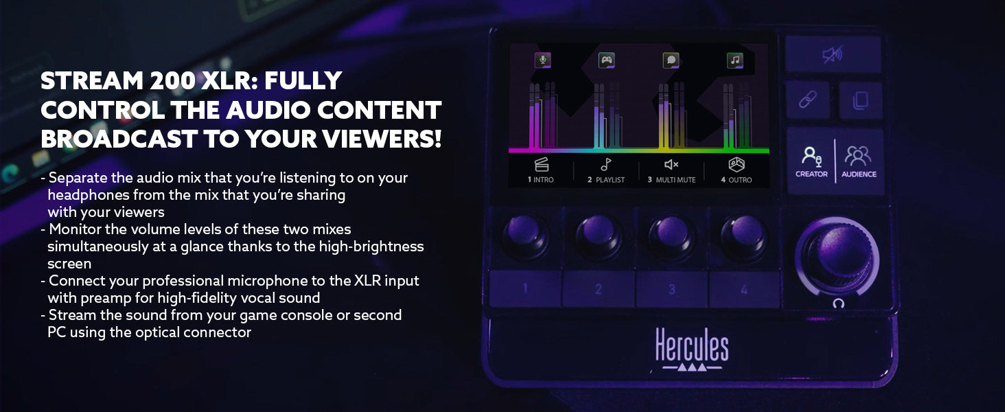 Hercules Stream 200 XLR is an audio controller featuring a built-in sound card, allowing streamers to separate the audio mix that they’re listening to from the mix being played for their audience. Thanks to this audio controller with a built-in LCD screen, you can manage all your audio sources in real time: games, chat software, music, XLR microphone, game console, second computer, and more. Hercules Stream 200 XLR lets you enjoy a customized experience by individually viewing and controlling the sound level of each audio track — for you, and for your audience! Instantly enable, turn down the volume, turn up the volume, mute or unmute the sound!