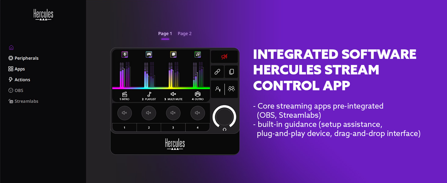 - Integrated software: Hercules Stream Control app. Core streaming apps are pre-integrated in the software,so you can easily manage your stream's scenes (OBS, Streamlabs), built-in guidance (setup assistance,plug-and-play product, drag-and-drop interface).